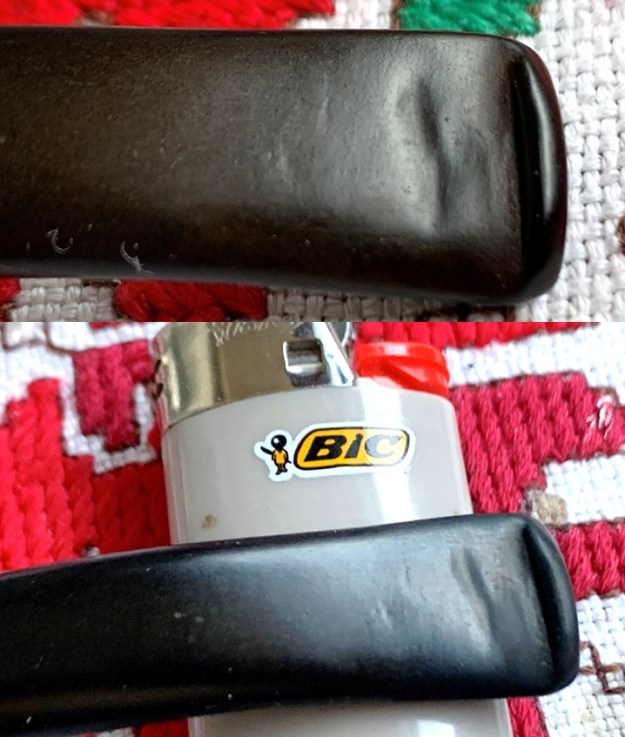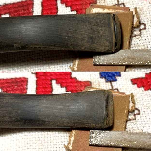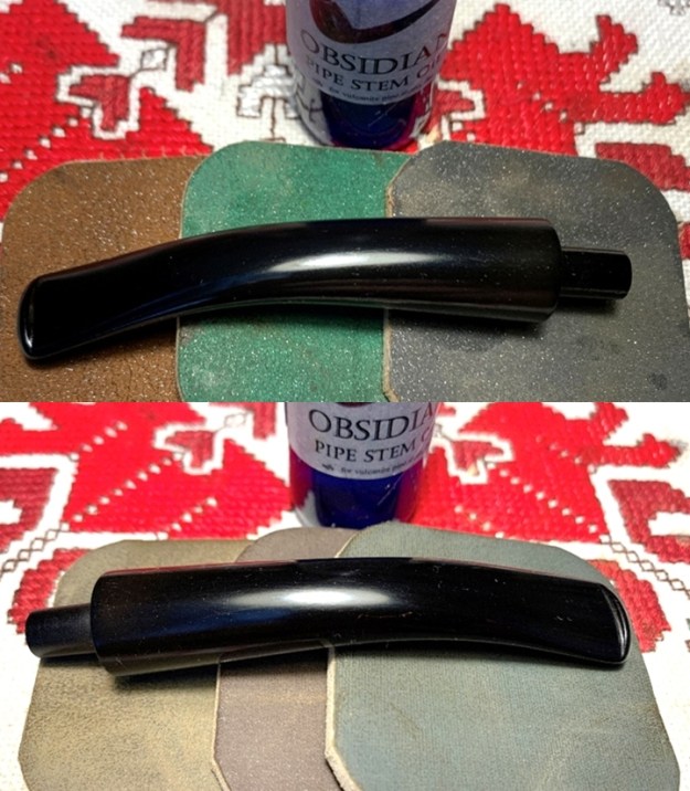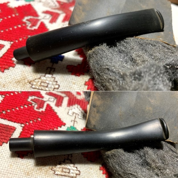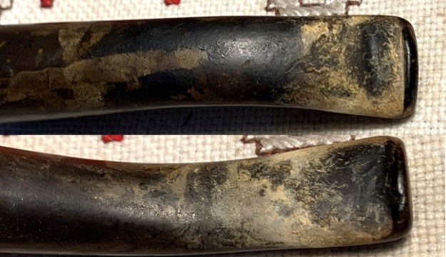 Switching my focus now to the stem, to expand the tooth compressions on the upper and lower bit, I first use the heating method. Using a Bic lighter, I paint the bit with the flame thereby warming and expanding the rubber compound, vulcanite. I take before and after pictures to show the comparison on the upper and lower.