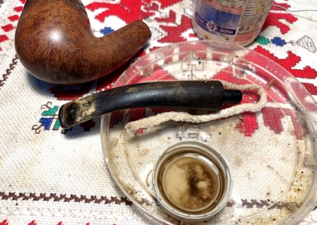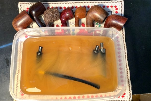 The next step is to give the stem a soak in Before & After Deoxidizer that does an adequate job of removing oxidation that isn’t too deep. The stem joins other stems and pipes in the queue. I let it soak for several hours.