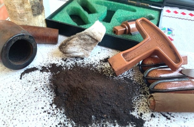 Next, turning to the bowl, I use the Pipnet Reaming Kit to start clearing the hard, thick carbon cake from the chamber. I use 3 of the 4 blade heads available in the kit to ream the bowl. I follow the reaming tool by scraping the chamber wall with the Savinelli Fitsall Tool. I finish by sanding the chamber with 240 paper wrapped around a Sharpie Pen.