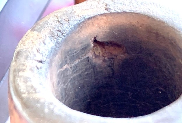 I transport the pipe to the kitchen sink and continue the cleaning using shank brushes and anti-oil dish soap. With the brushes the mortise is scrubbed. After a thorough rinsing, the bowl is back on the worktable.