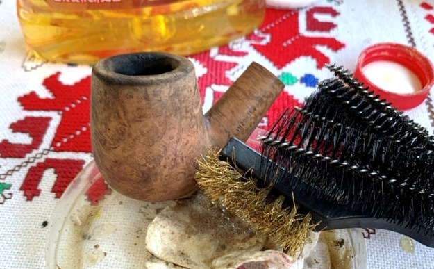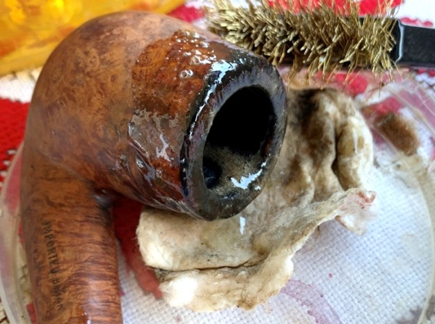 Next, I continue with the cleaning of the external surface using undiluted Murphy’s Oil Soap on a cotton pad. I also utilize a brass bristled brush to work on the lava covered rim. Brass does not damage the briar and adds some cleaning power.