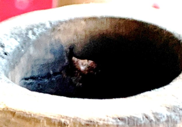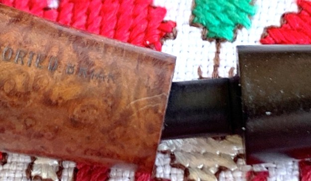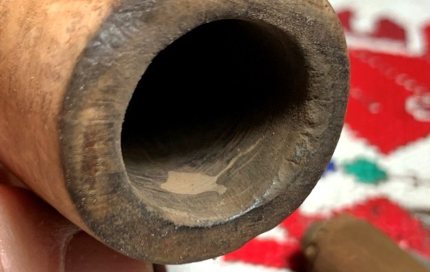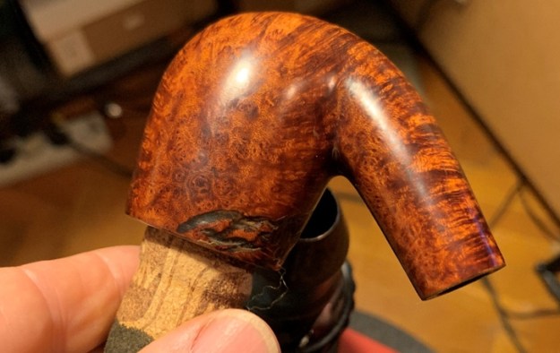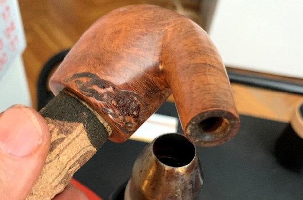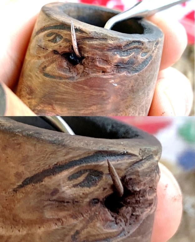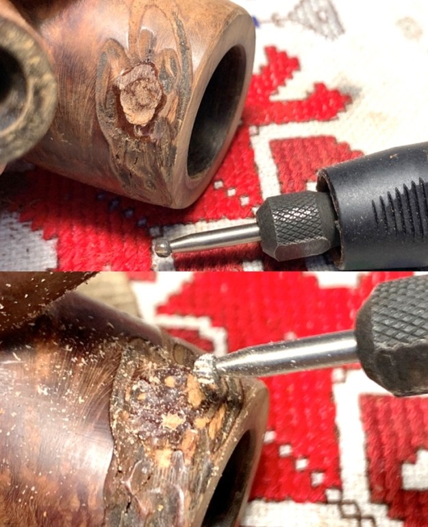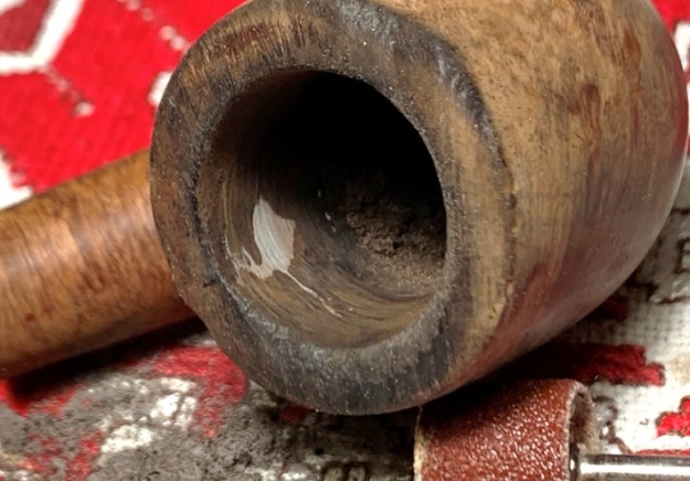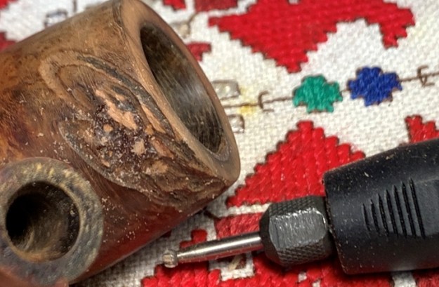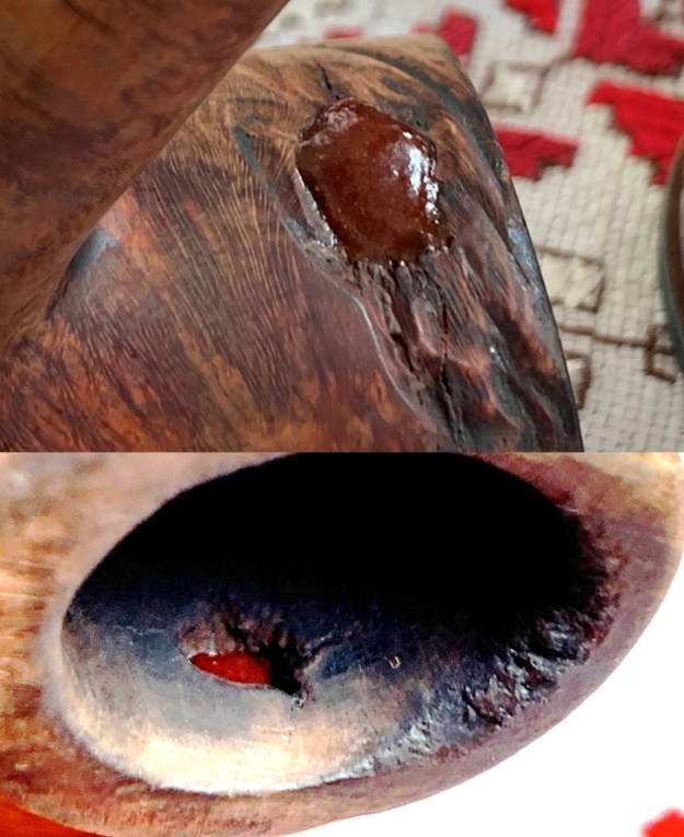 The bigger surprise comes after inspection of the sculpted area. The center of the sculpting is a filler. The question is, was the sculpting used to hide an imperfection in the briar itself or to blend a repair possibly caused by a burn-through? I don’t believe it’s a burn through, but the fill corresponds to the hole in the chamber.