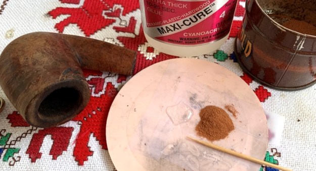 After cleaning the area with alcohol, I begin by mixing briar dust with BSI Extra Thick Maxi-Cure CA glue using a toothpick. I draw briar dust into the puddle of glue until the thickness is that of molasses. I then use the toothpick to trowel the putty to the hole. I press the putty into the hole partially to fill it. I use an accelerator to quicken the curing and to hold the patch in place.
