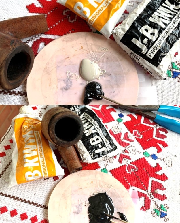 My approach to repairing the hole in the stummel is to first start with applying briar dust putty to the external briar side. I don’t push the putty through into the chamber but leave a gap that will be filled with JB Weld on the internal fire side. Using burrs with the Dremel, I’ll ‘re-sculpt’ the external surface to blend the patch. Working on a plastic disk as a mixing palette, scotch tape helps with an easy cleanup.