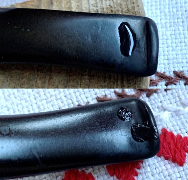 The heating method may have helped some, but not enough to avoid using Black CA glue to spot drop patches on the upper and lower bit. After applying the CA glue, I put the stem aside for the patches to cure.