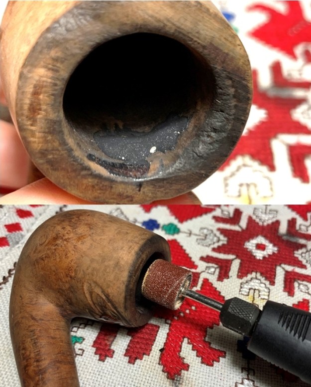 With the stem on the side curing, I turn again to the stummel. The JB Weld patch has fully cured. To remove the excess epoxy and to smooth the chamber wall, I mount a sanding drum to the Dremel. It does a quick and good job.