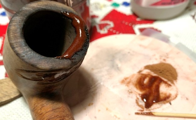 I mix briar dust with Extra Thick CA glue by gradually pulling briar dust into the puddle until it reaches the thickness of molasses. Then the briar putty is applied with the toothpick to the inside of the lip to build up toward the rim and in toward the chamber. I use an accelerator to quicken the curing process.