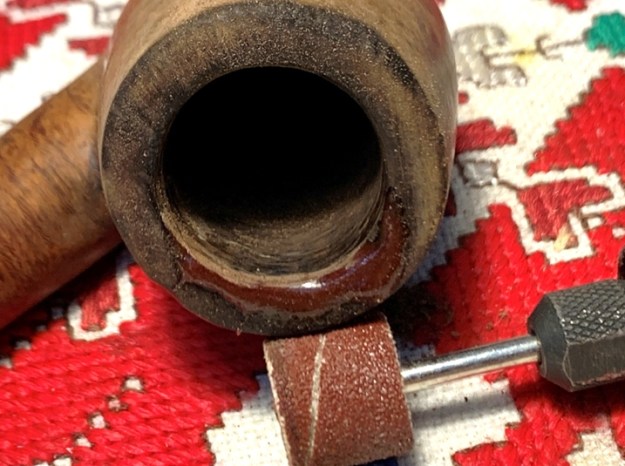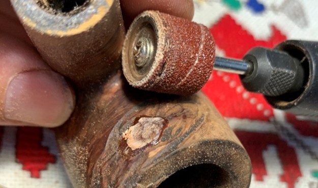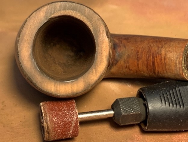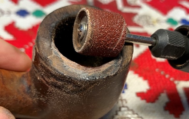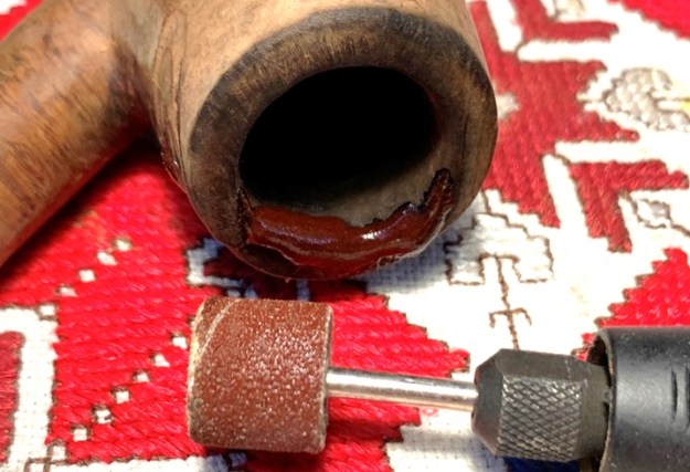 The rim briar dust putty rebuild is fully cured and using the sanding drum mounted onto the Dremel, I begin removing the excess patch material on the internal chamber wall. The goal is to restore a rounded chamber.