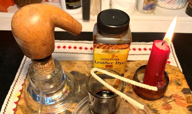 I begin by heating the stummel with a hot air gun. The gun heats and expands the briar helping it to be more receptive to the dye. I then paint the stummel with the aniline dye using a folded pipe cleaner and with each section, I ‘flame it’ by lighting it with the lit candle with the result that the alcohol in the dye combusts leaving behind the dye pigment.