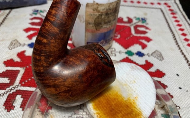 Next, I wipe the stummel with a cotton pad wetted with alcohol not so much to lighten but to remove excess dye ‘clumped up’ that was missed through the buffing process.