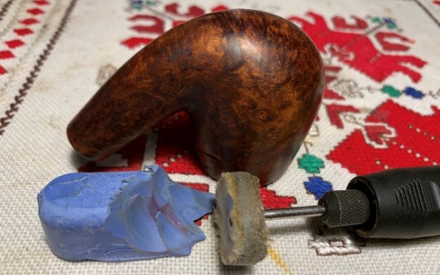 Next, I reunite stem and stummel and apply (stem attachment not shown!) and apply Blue Diamond compound. With a cotton buffing wheel attached to the Dremel, the speed is set at approximately 40% full power and the compound is applied to pipe. After applying the compound, a felt cloth is used to wipe/buff the pipe to remove any compound dust in preparation for adding wax.