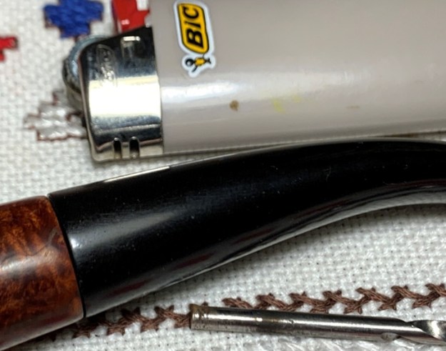 I then heat the mortise carefully with a Bic lighter to warm the vulcanite making it more supple. As the mortise heats, I gently insert the larger drill bit into the airway expanding the diameter of the tenon as I go.