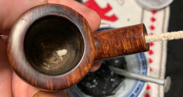 After wiping the chamber with a cotton pad wetted with alcohol, I discover what appears to be some heating damage on the upper backside of the chamber – behind the sculpting. There is a hole with a crevasse cutting to the left from the deep pit. This will need attention after the cleaning of the stummel is completed.
