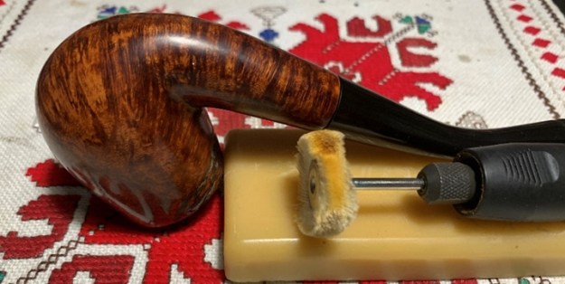 The next day, after rejoining stem and stummel, carnauba wax is applied to the entire pipe. Another cotton cloth buffing wheel is mounted on the Dremel for this purpose and the speed is maintained at 40% full power. After the application of a few coats of wax, the pipe is given a rigorous hand buffing with a microfiber cloth to remove any excess wax and to raise the shine.