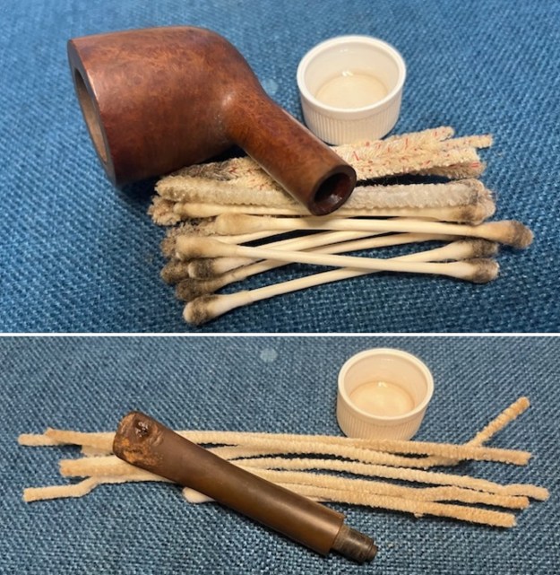 I cleaned out the shank, the airway and the mortise with alcohol, cotton swabs, hard bristle and soft bristle pipe cleaners. It was a very dirty pipe which just meant that it had really been enjoyed by the previous pipe man. Since I was restemming the pipe I would do the clean out on the new stem when I got to it.