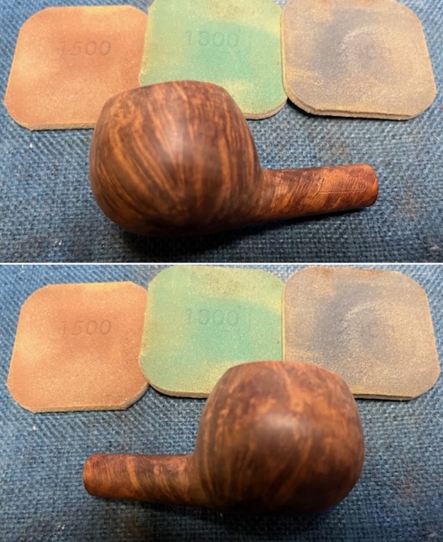 I sanded the surface of the new vulcanite stem with the 2 x 2-inch sanding pads – 320-3500 grit pads to clean up the sanding marks on the stem surface. By the final 3500 grit pad the stem started to really shine.