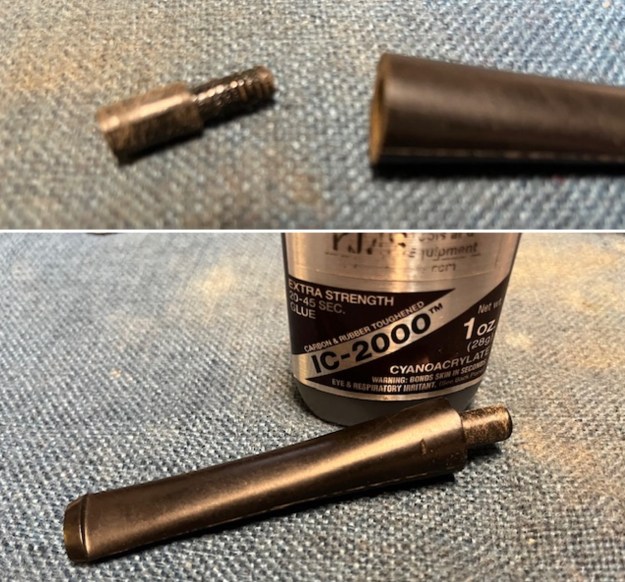 The taper stem had a small bite through on the underside ahead of the button. I greased a pipe cleaner and inserted it in the airway below the small hole. I filled in the tooth marks in the top of the stem as well. I removed the pipe cleaner to continue working on the stem.