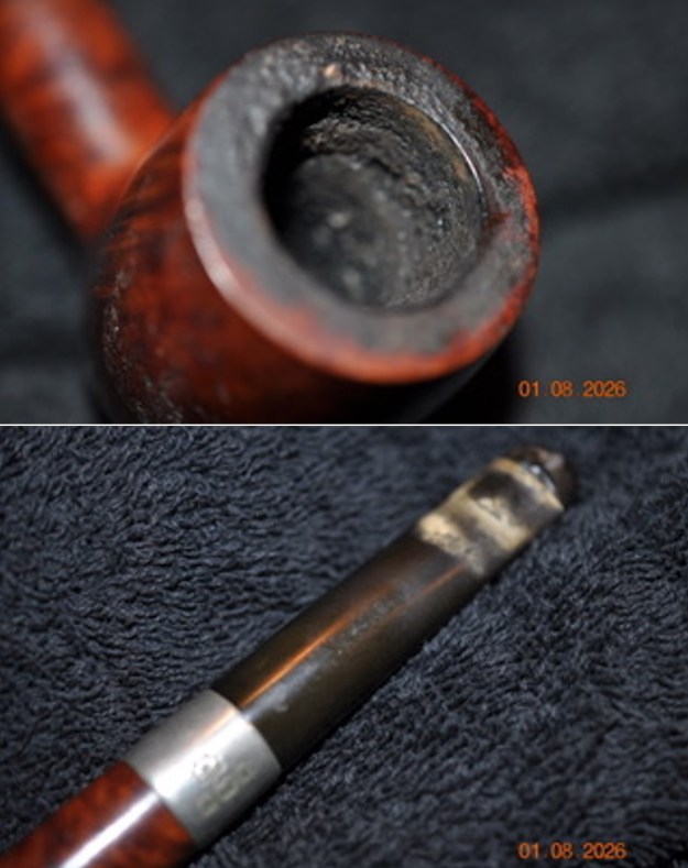 Jeff took photos of the rim top and stem to show the general condition of the pipe. The bowl is heavily caked so it is hard to know the condition of the edges under the lava overflow. The stem was oxidized, calcified and had tooth marks on the top and underside.