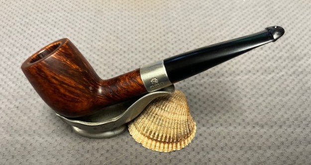 Shamrock (c1941-2009) Originally stamped SHAMROCK with no brand name, an inexpensive line first described in George Yale (New York) mail order booklet in 1941, imported by Rogers Import. The line was actively promoted beginning in ’45, aggressively promoted in US by Rogers from early ‘50s when they registered the Shamrock logo with US Patent Office, claiming propriety since ’38. Over the years offered with P-lip or fishtail mouthpiece, with or without nickel band, with or without Shamrock logo on the band, with or without S stamped in white or later in gold on mouthpiece. Appearing in 2008 as unstained smooth and rustic, fishtail mouthpiece with gold impressed P on the stem. COMS of MADE IN over IRELAND (C1945-1965), MADE IN IRELAND forming a circle (c1945-1965), “A PETERSON’S PRODUCT” over MADE IN IRELAND (c1945-1965), MADE IN THE over REPUBLIC over OF IRELAND9c1948-1998). Model is always difficult or impossible to date.