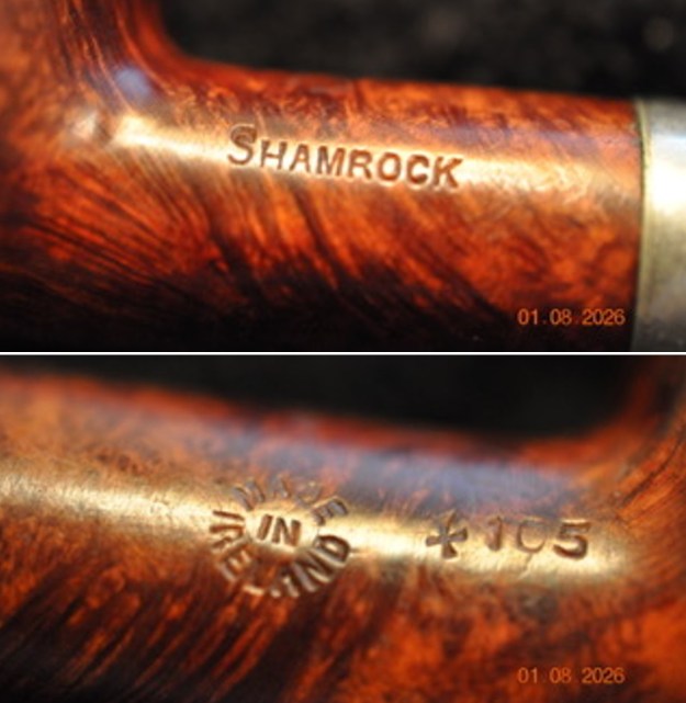 Judging from the description above, the pipe I am working on is stamped with the stamp noted in red above. Made in Ireland in a circle which narrows the date to between approximately 1945-1965. It is just stamped SHAMROCK with no brand name and no stamping on the stem.
