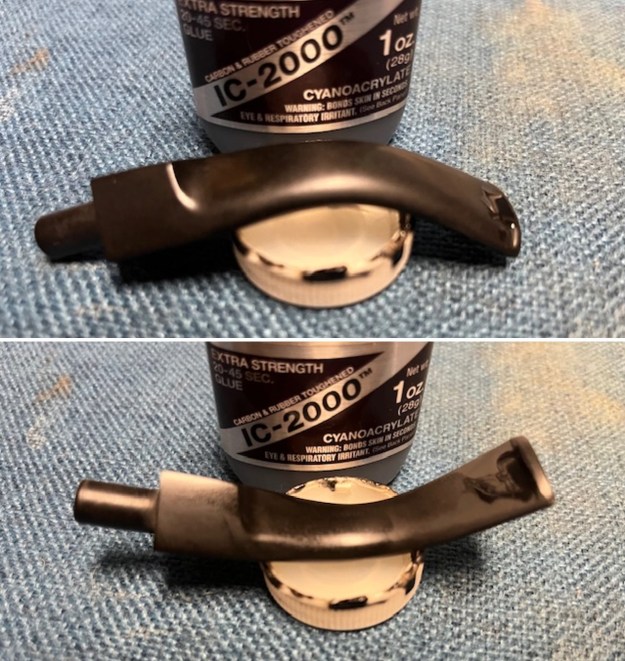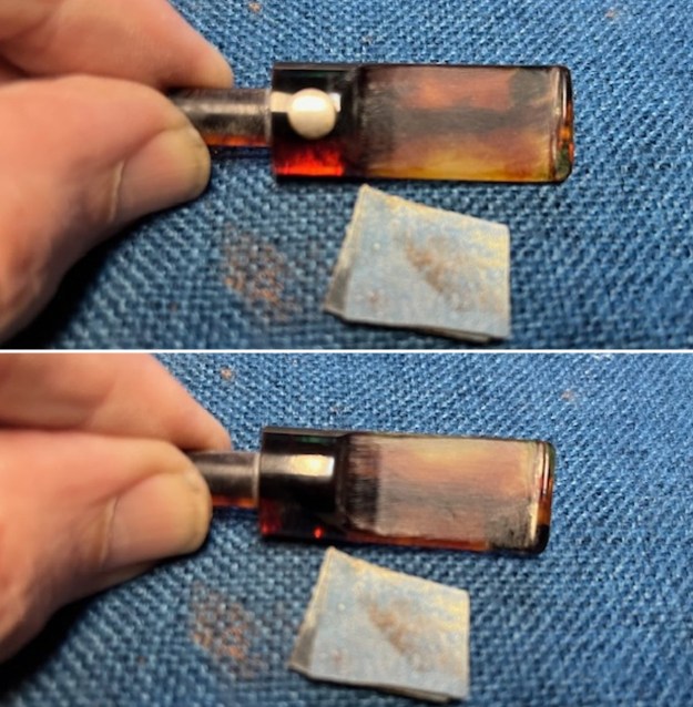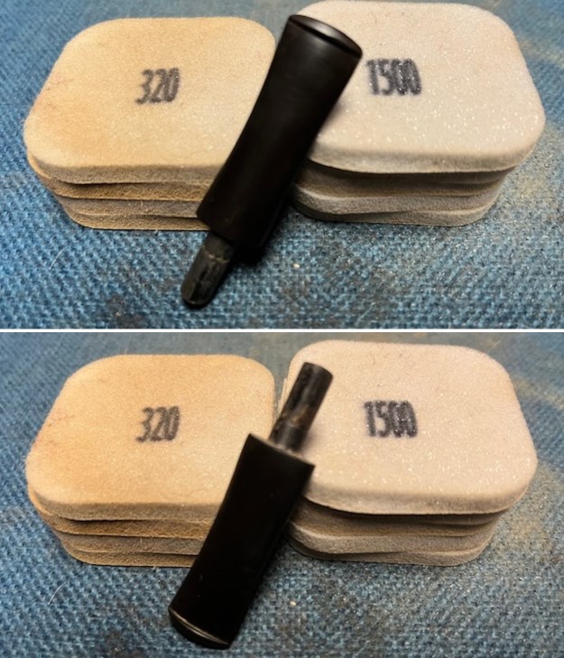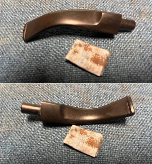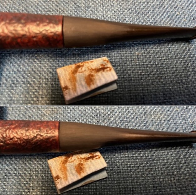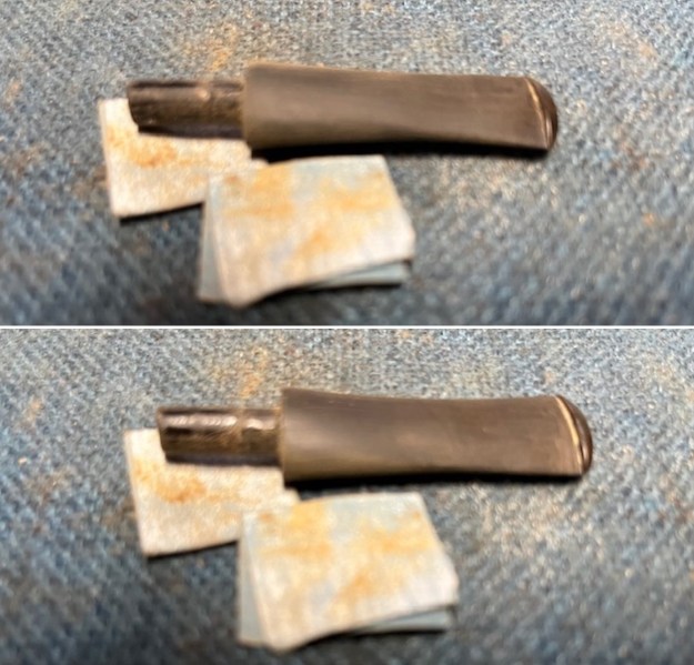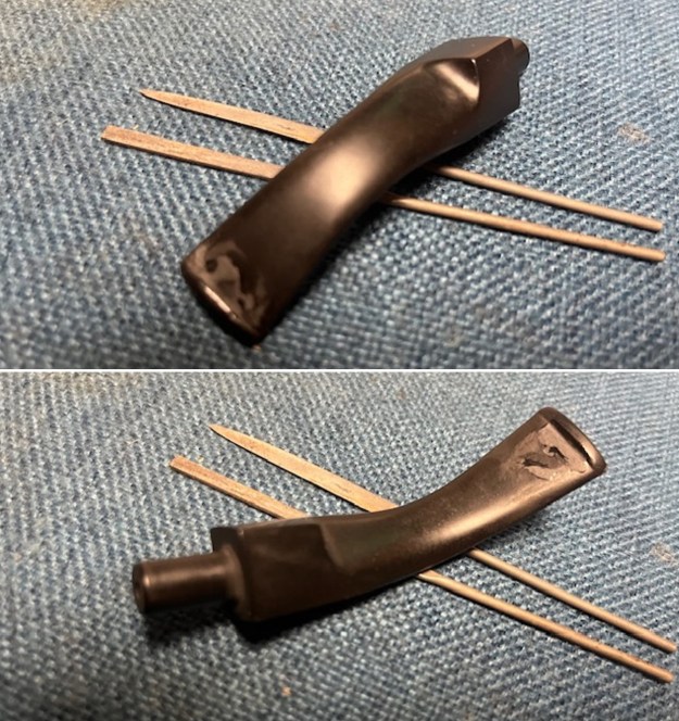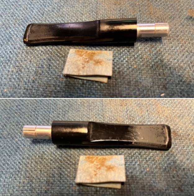I set the bowl aside and turned my attention to the stem. I painted the tooth marks on the top and underside of the stem with the flame of a lighter. I was able to slightly lift the marks and filled in what remained with black, rubberized CA glue. Once it cured I use small files to flatten the repairs. I cleaned them up with a folded piece of 220 grit sandpaper to blend them into the surface of the stem.