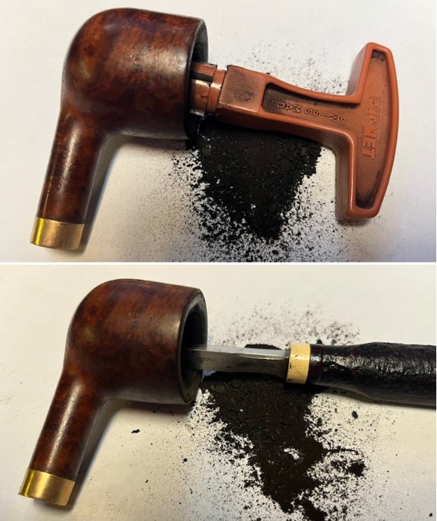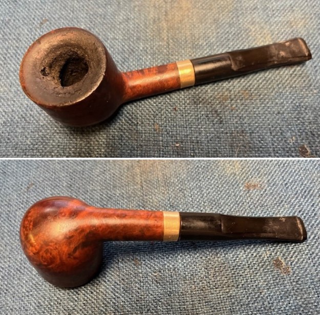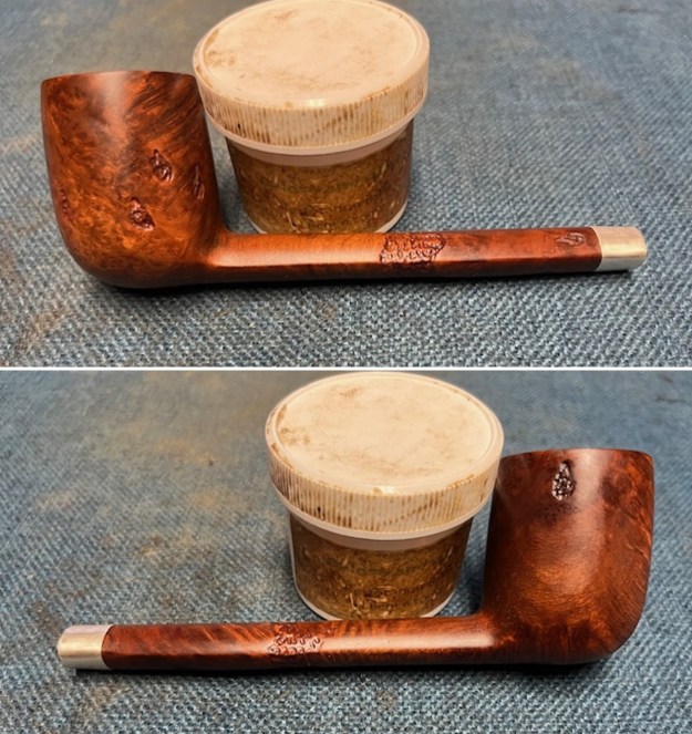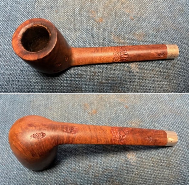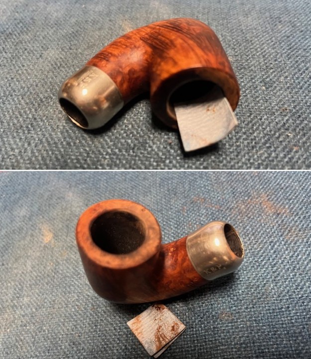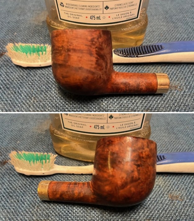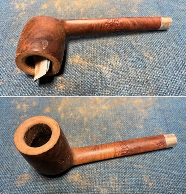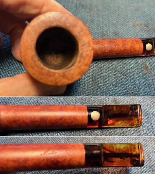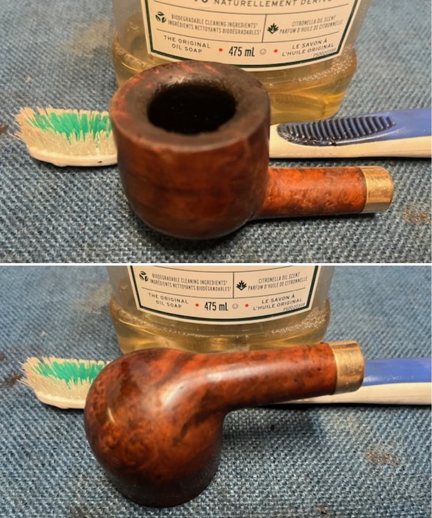 With that information at hand I turned to work on the pipe itself. Jeff had thoroughly cleaned up the pipe. He reamed the pipe with a PipNet Pipe Reamer and cleaned up the remnants with a Savinelli Fitsall Pipe Knife. He scrubbed the bowl with undiluted Murphy’s Oil Soap with a tooth brush. He rinsed it under running warm water to remove the soap and grime. He cleaned out the inside of the shank and the airway in the stem with alcohol, cotton swabs and pipe cleaners. He scrubbed the exterior of the stem with Soft Scrub to remove as much of the oxidation as possible. He soaked the stem in Briarville’s Pipe Stem Deoxidizer and rinsed it off with warm water. I took photos of the pipe once I received it.