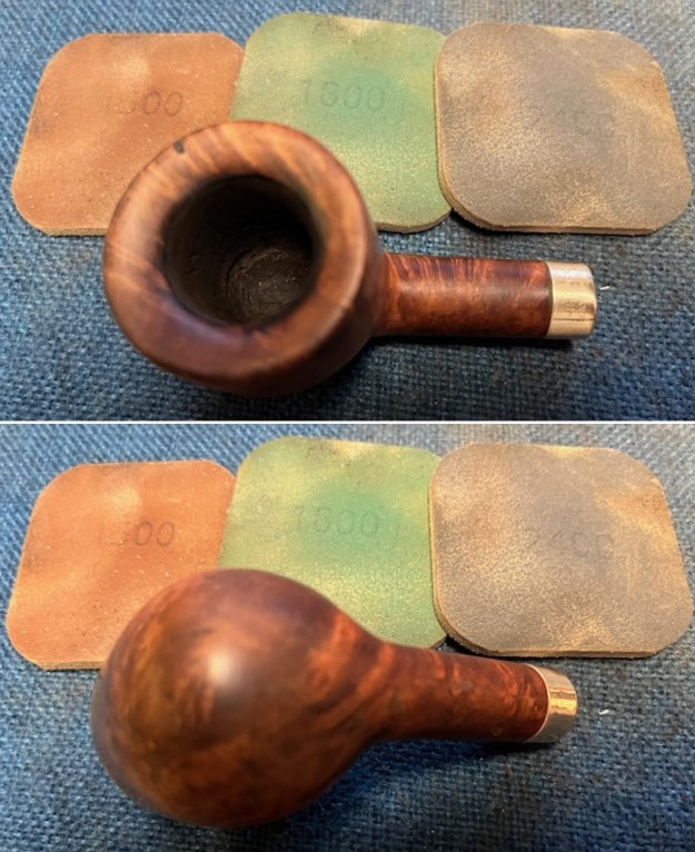 I sanded the stem with 320-3500 grit 2×2 inch pads to further adjust the fit of the stem to the shank. I wiped the stem down with an Obsidian Oil cloth after each sanding pad.