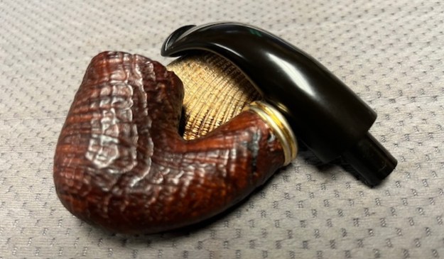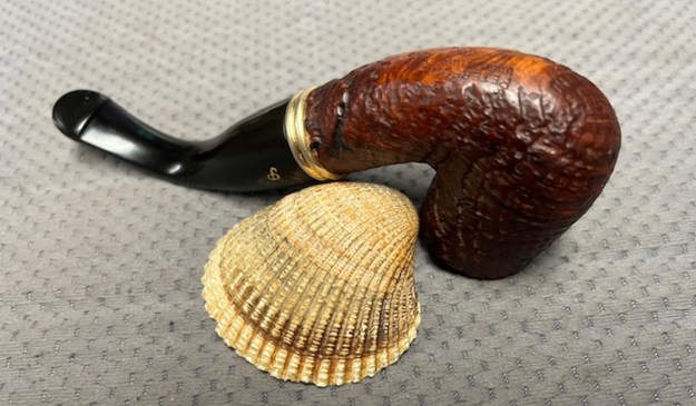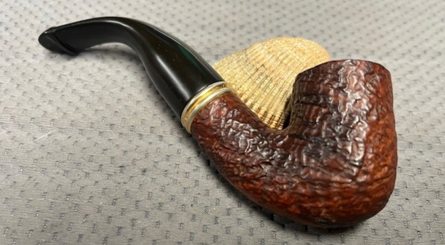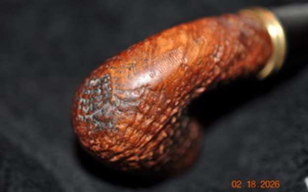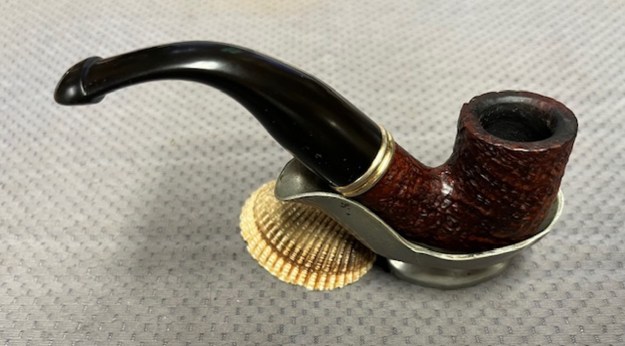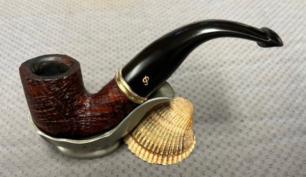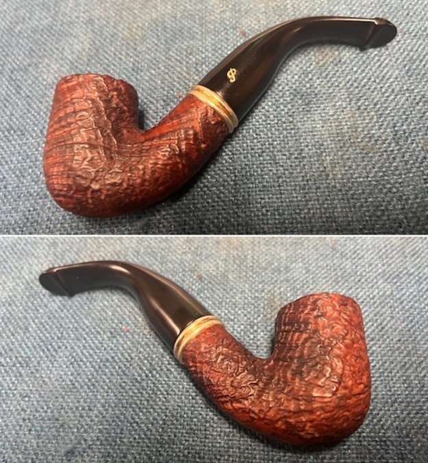 This gave me information regarding the date of the line. It was available between 1997-2005 and the description fit the pipe I have in hand. It is a sandblast pipe with the bands as described and a taper P-lip with a brass P logo on the left side of the stem.