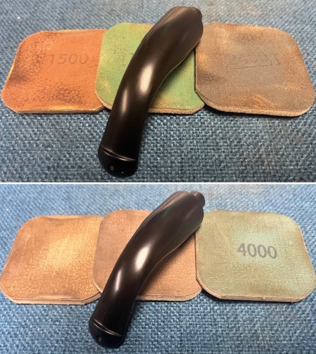 I set the bowl aside and turned my attention to the stem. I sanded out the tooth chatter and light marks on the underside of the stem with 320-3500 grit 2×2 inch sanding pads. I wiped the stem down with an Obsidian Oil cloth after each sanding pad. It began to look very good.