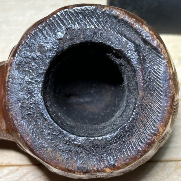 Next on the chopping block is a robust, rugged, rusticated pipe which I acquired in a lot of pipes from a gentleman living on Vancouver Island. He had quite an assortment of pipes and they ranged from the ridiculous to the sublime. This is not a Custom-Bilt – it is a BP Jum. They could easily be mistaken for one another. This is a very handsome pipe and promises to be a great smoker. It’s a bent pot (or a “War Club”, as Steve calls it), with a vulcanite, wide saddle stem. And what a wonderful rustication on this one! On the left side of the shank, the markings read BP Jum [over] Imported Briar. These are the only markings.The history of BP Jum, like many pipes of the same era, is shrouded in some mystery. The brand name has no mention on either Pipedia or Pipephil. Some pipe folks have proposed that BP Jum pipes are, in fact, Custom-Bilt seconds, but there is no direct evidence to support this. In previous restorations that Steve has done, he wrote the following: “There was a lot of conjecture as to whether the brand was made by Tracy Mincer of Custombilt fame. There is no definitive proof other than the common shapes, sizes and look of the pipes. Bill Unger, of Custombilt fame and author of a history of the brand, mentions BP Jum but cannot definitively connect the two. So the maker remains a mystery that is still unsolved.”