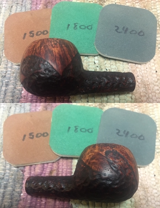 Next, I subjected the smooth surfaces over the stummel to a complete cycle of micromesh polish, wet sanding with 1500 to 12000 grit pads. I wiped the stummel with a moist cloth after every grit pad to remove the sanding dust left behind by the pads. This also helps in monitoring the progress being made and ensures early corrective action. I am happy with the progress being made until now.