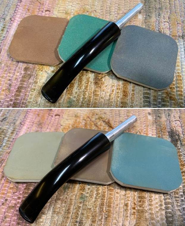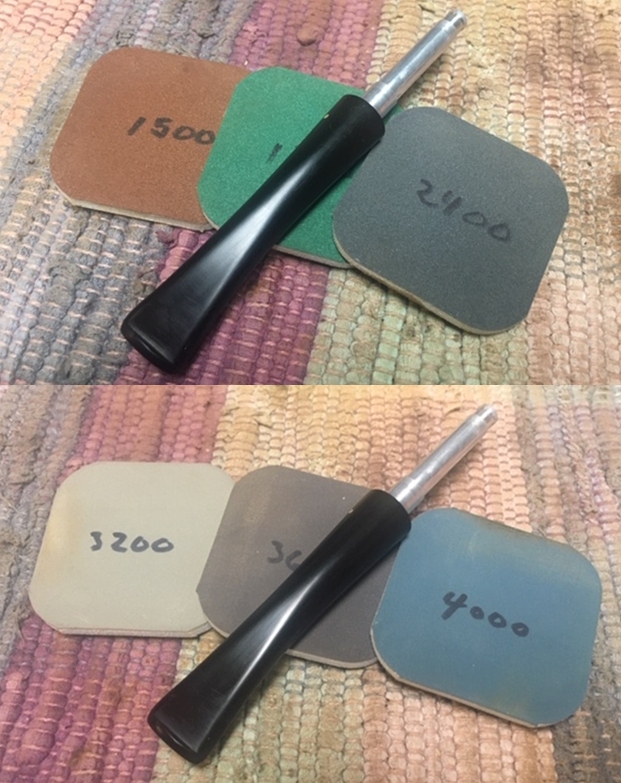 I continued to work on the stem and progressed to wet sanding the entire stem with a folded piece of 320 followed by 600, 800, 1000, 1500 and 2000 grit sand papers. Thereafter, I polished the stem by dry sanding the stem with 3200 to 12000 grit micromesh pads. I strictly avoided running the lower grit sand papers over the four brass dots, polishing them with 6000 to 12000 grit micromesh pads. I rubbed a small quantity of EVO into the stem surface and set it aside for the vulcanite to absorb and hydrate.