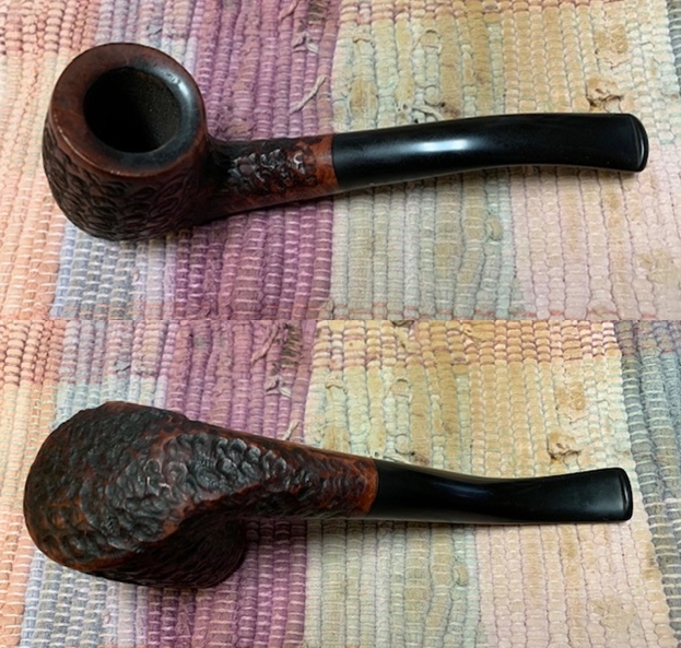 “I have dubbed the decades between 1980 and 2000 the Late Canadian Era, a period that saw several changes at Brigham that are of note to the collector. First, the traditional 8-grade pinning system (the famous Brigham “Dots” which denoted the quality of the pipe) was changed to a 7-grade system to simplify pinning (more on this below), and the Norsemen and Valhalla series were merged to form the President Series, which represented the very finest pipes coming out of the Toronto factory. Early pipes from this era (left, below) are stamped with a shape number and “Brigham” over “Canada”; later pipes (late 1980s+, on right below) are stamped simply with a shape number and the Brigham logo.”