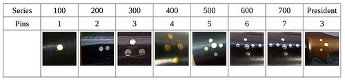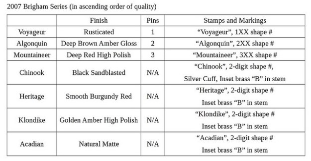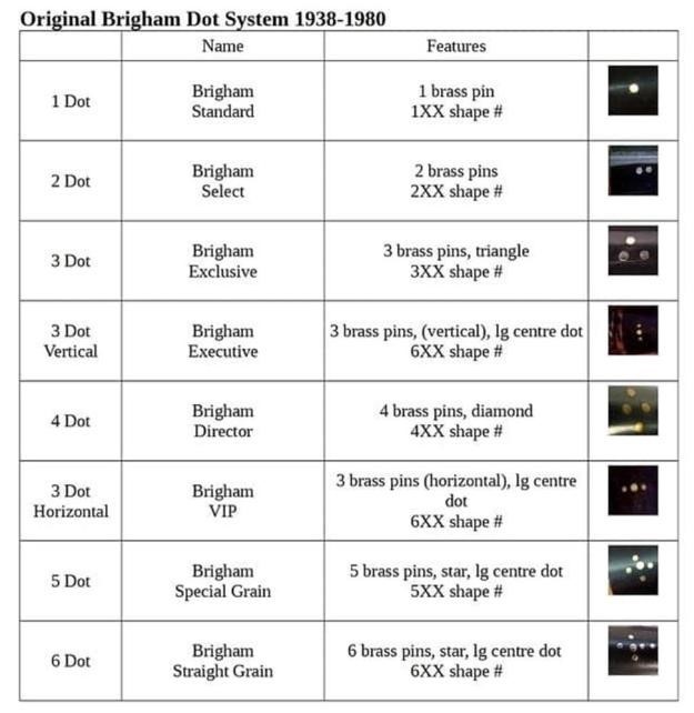 Brigham pipes are reknown in the pipe world for their famous “Brigham Dots”, a system of brass pins inset in the stem to denote the grade of each pipe. The original 8-grade pinning system, used for 42 years between 1938 and 1978 (spanning the Patent, Post-Patent and Canadian Eras) looked like this: