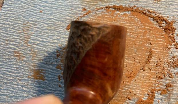 While the stem repairs were set aside to cure, I moved on to reaming the chamber with my PipNet pipe reamer. I started the reaming process with head size 1 of the PipNet reamer blade and progressed through to head size 2. I used my fabricated knife to remove cake from areas inaccessible to the reamer blades and completed the process of removing the cake by sanding the walls smooth with a folded piece of 180 grit sandpaper. I wiped the chamber with a cotton swab wetted with alcohol to clean the residual carbon dust. The chamber walls are solid and the hard layer of cake had worked well to protect the chamber walls.