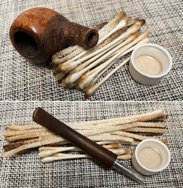 Continuing with the internal cleaning of the chamber and mortise, I subjected it to a salt and alcohol bath. I used cotton balls which is an at par substitute as I have realized over the years. I drew out a wick from the cotton and along with a folded regular pipe cleaner; inserted it into the mortise and through the draught hole and further into the chamber. Thereafter, I packed the chamber with cotton balls to about quarter of an inch below the rim inner edge and soaked the cotton balls with isopropyl alcohol up to the brim. About half an hour later, the level of alcohol had gone down, having being absorbed by the cotton. I topped it up once again and set it aside overnight. By next afternoon, the cotton and alcohol had drawn out all the remaining oils/ tars from the chamber and mortise and loosened out any residual cake and tar build up, fulfilling it’s intended task. I removed the cotton balls and ran pipe cleaners through the mortise to clean out all the loosened tars and gunk. Using my fabricated tool, I scraped out the entire loosed gunk from the mortise and further cleaned it with alcohol and q-tips. The large blobs of now moistened gunk that was removed from the mortise should give the readers an idea of how filthy the mortise was when I started the process of cleaning. The chamber now smells clean and fresh.