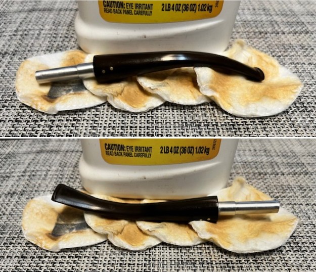 The next afternoon, I removed the stems that had been soaking in the deoxidizer solution overnight. I cleaned the stem and the stem airway under running warm water and scrubbed the raised oxidation from the stem surface using a Scotch Brite pad and the airway with thin shank brush. I further removed the oxidation by scrubbing the stem with 0000 grade steel wool and applied a little olive oil to rehydrate the stem. I used the steel wool to clean the aluminum tenon and it did make a world of difference to the appearance of the tenon.