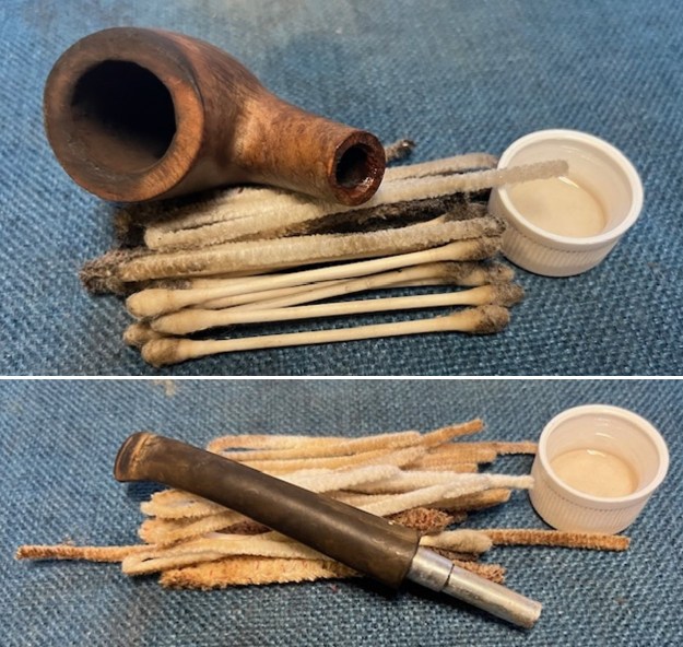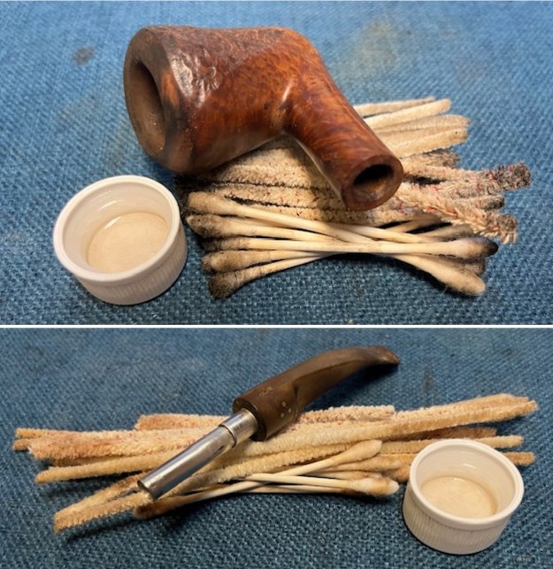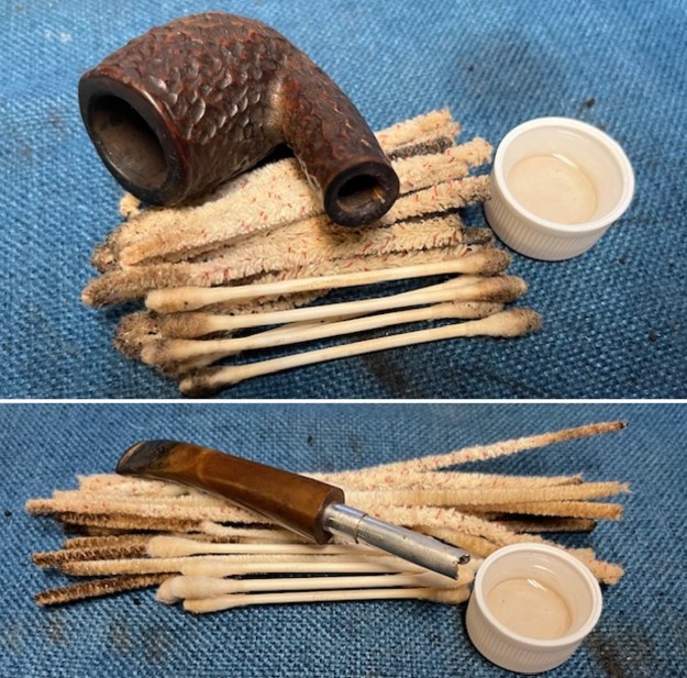 Similar to the stem, I then cleaned the stummel with both pipe cleaners and cotton swabs dipped in lemon-infused 99% isopropyl alcohol. With a pipe this dirty, it took quite a while and much cotton to clean. It was very dirty.