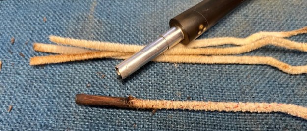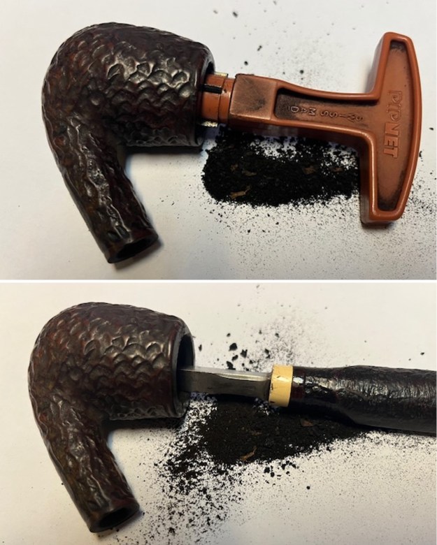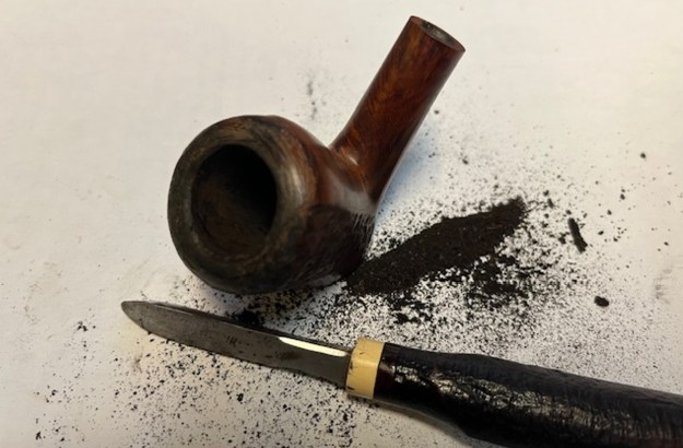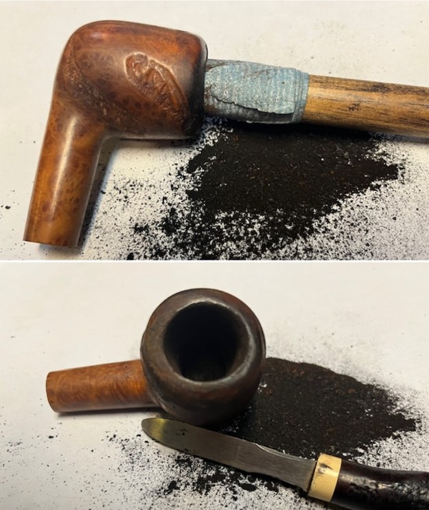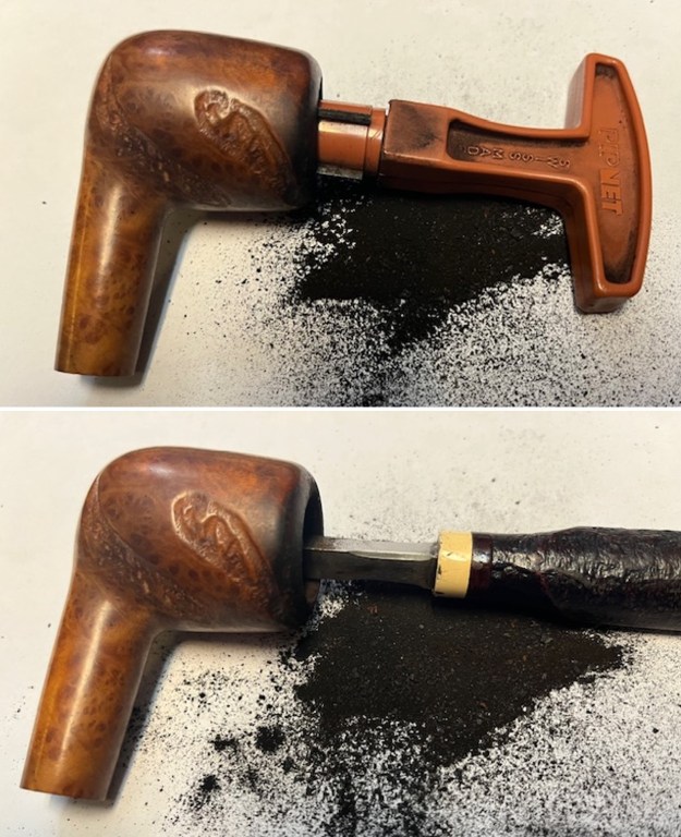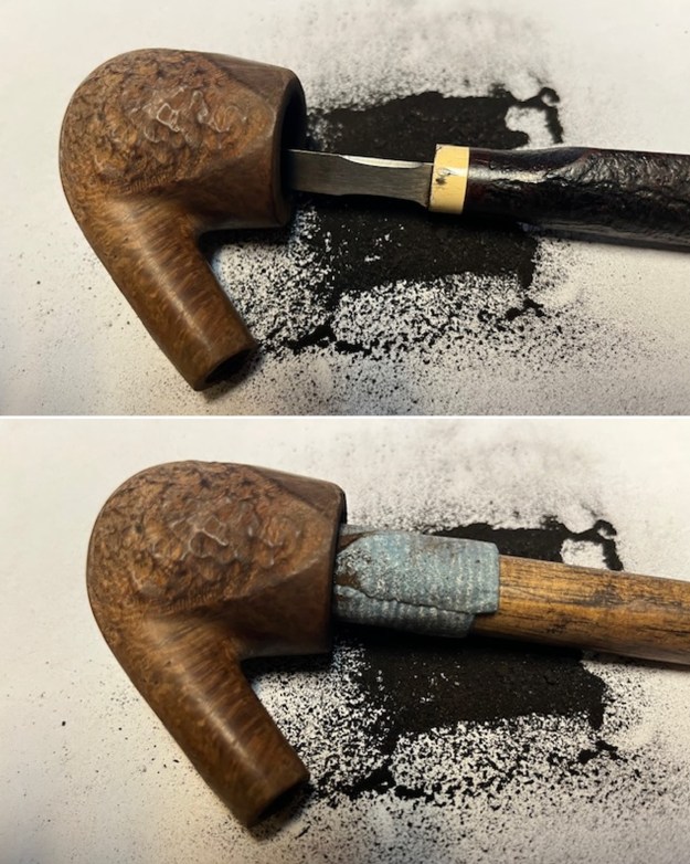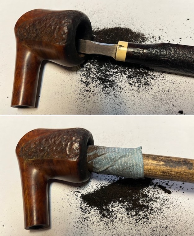 As the stem was (nearly) complete, I moved on to the stummel. The first step was to ream out the bowl – that is to say, remove all the cake inside the bowl. This accomplished a couple of things. First (and most obviously), it cleaned the bowl and provided a refurbished chamber for future smoking. Second, when the old cake was removed, I could inspect the interior walls of the bowl and determine if there was damage or not. I used a reamer, a pipe knife, and a piece of sandpaper taped to a wooden dowel. Collectively, these ensured that all the debris was removed.