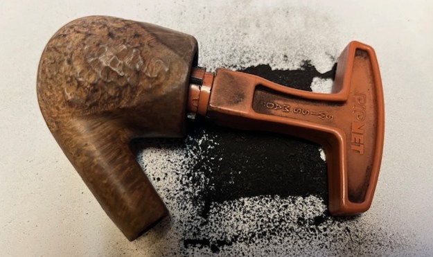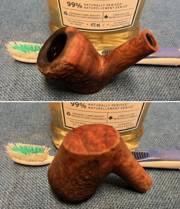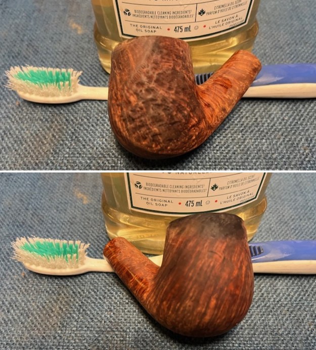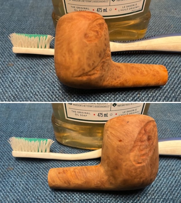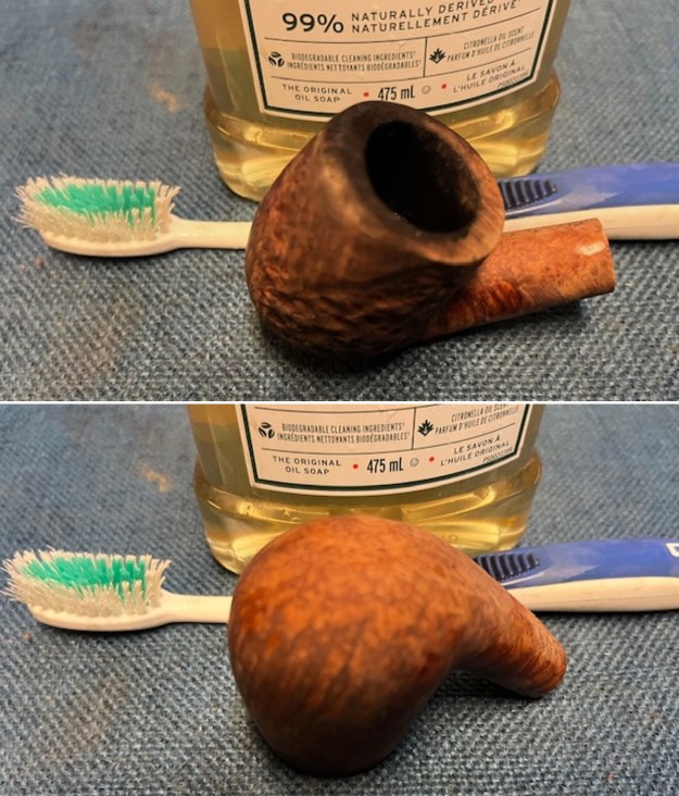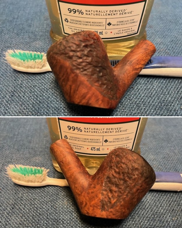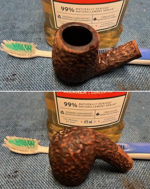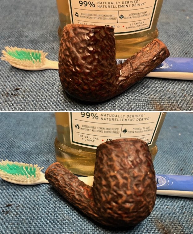 To tidy up the briar, I wiped down the outside, using a solution of a pH-neutral detergent and some distilled water, with cotton rounds. I also used a toothbrush in the crevices. This did a good job of cleaning any latent dirt on the surface of the briar. The last step of the cleaning process was to scour the inside of the stummel with the same mild detergent and tube brushes. This was the culmination of a lot of hard work in getting the pipe clean.