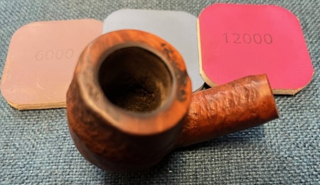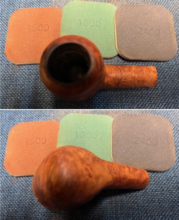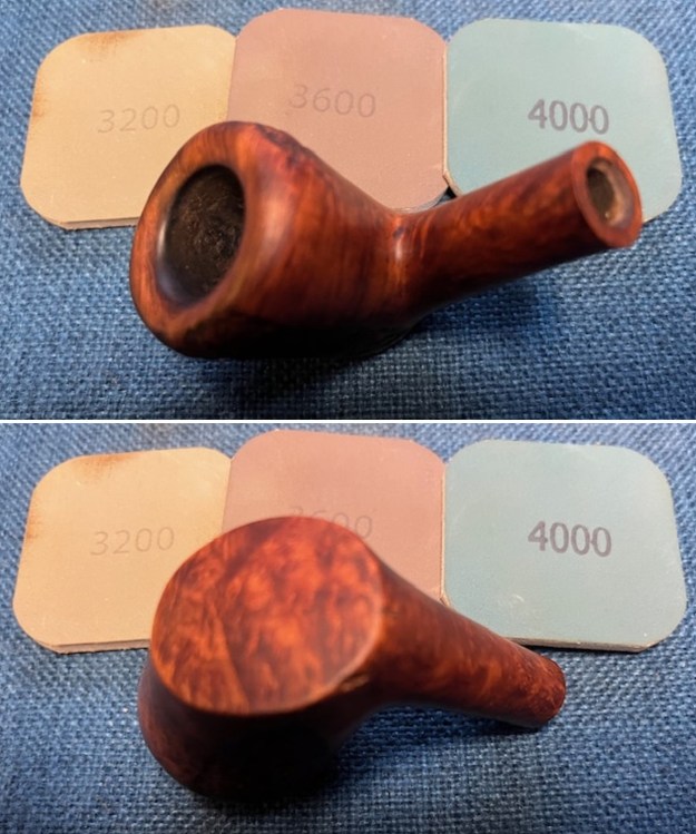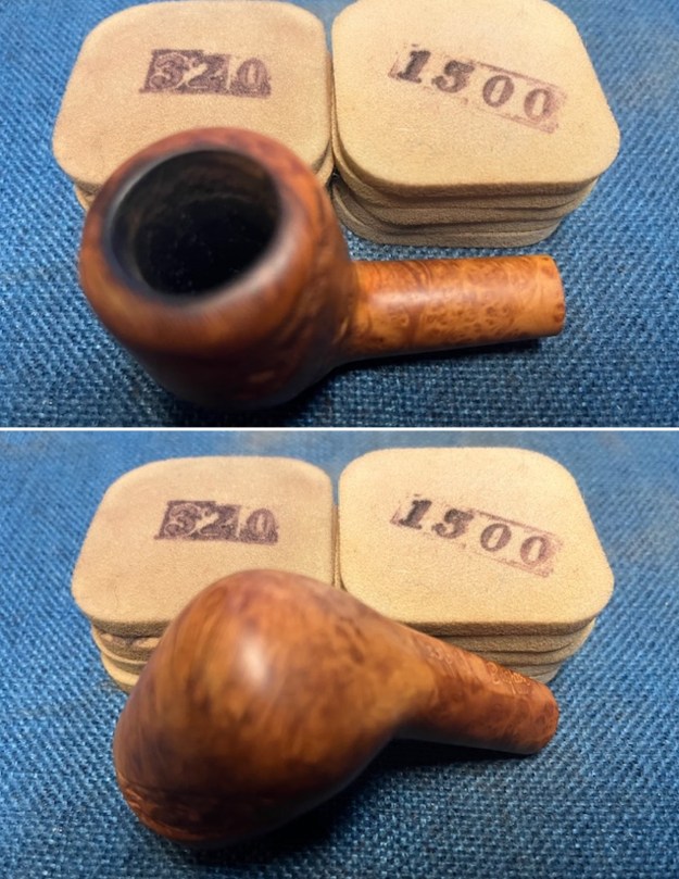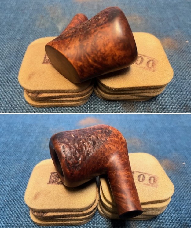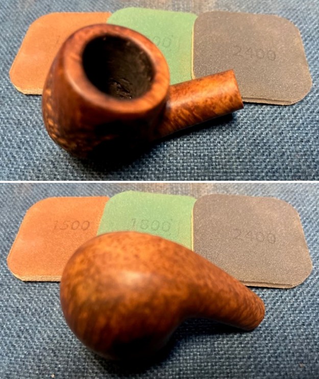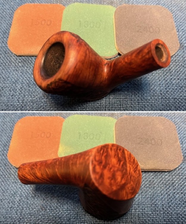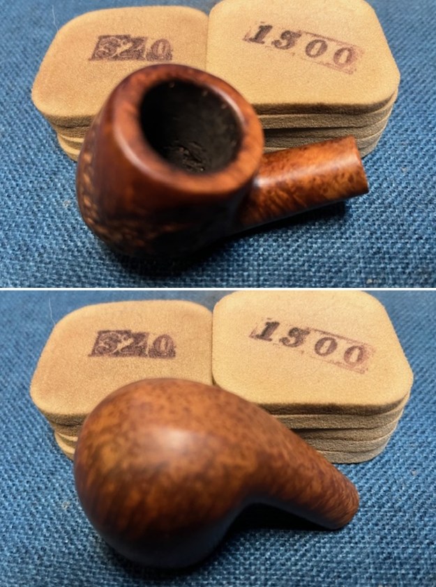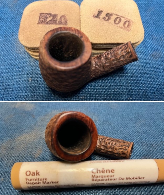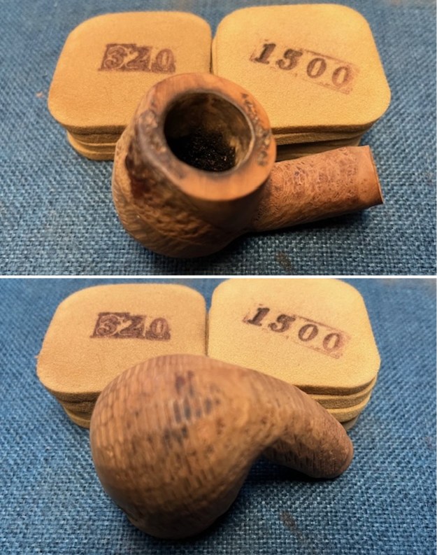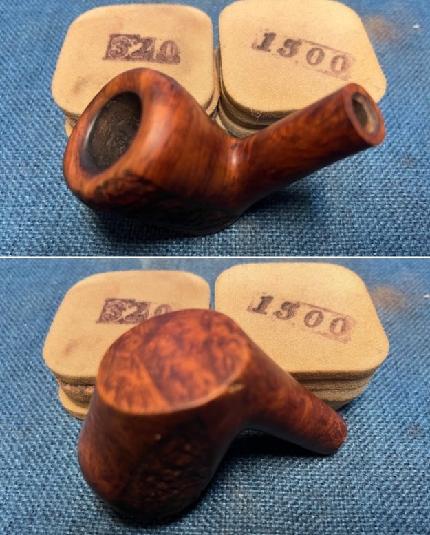 In order to lessen the burns damage on the rim, I ‘topped’ the pipe – that is to say, I gently and evenly sanded the rim on a piece of 400-grit sandpaper. This effectively minimized the damage, without altering the look of the pipe. Fortunately, this required only minimal topping.