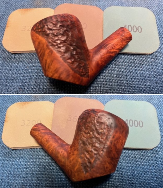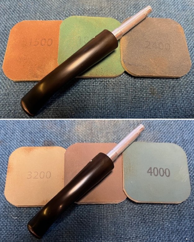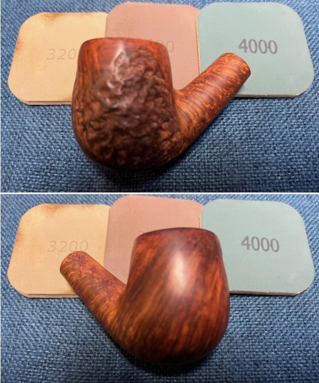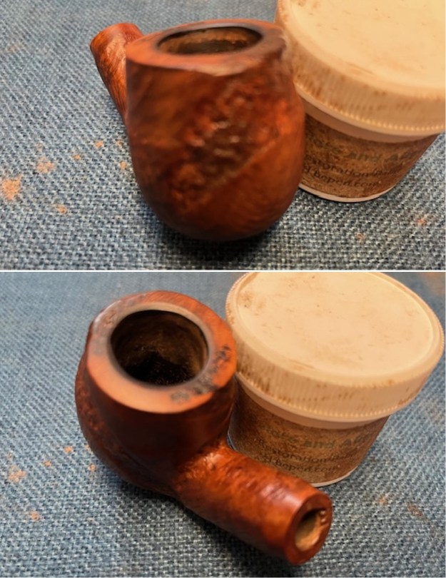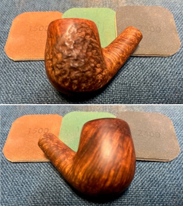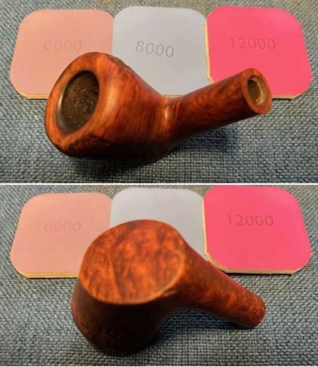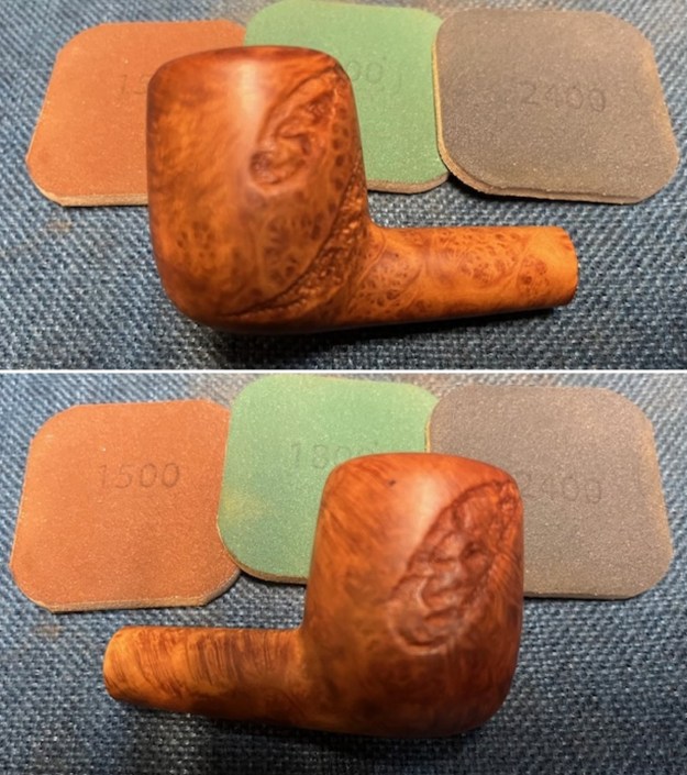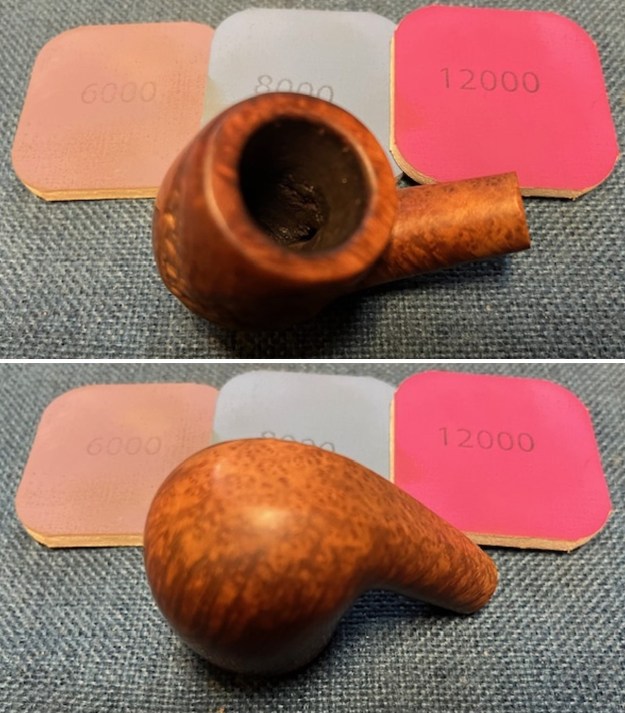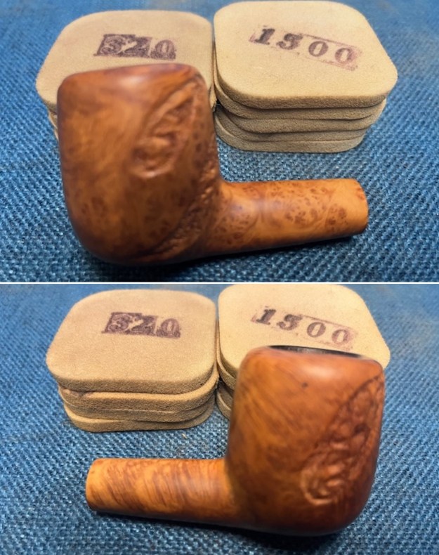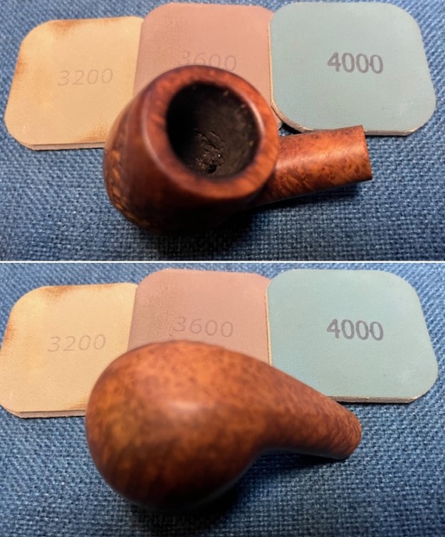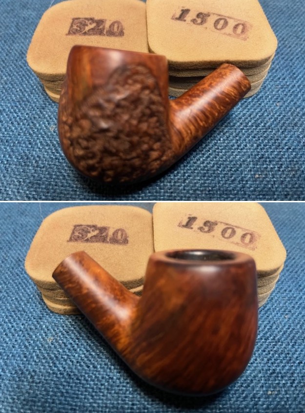 In order to lessen the burns damage on the rim, I ‘topped’ the pipe – that is to say, I gently and evenly sanded the rim on a piece of 400-grit sandpaper. This effectively minimized the damage, without altering the look of the pipe. Fortunately, this required only minimal topping.