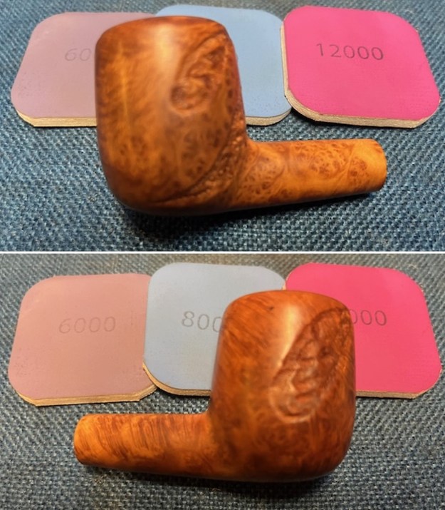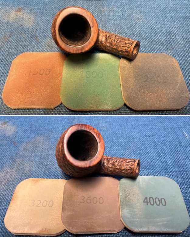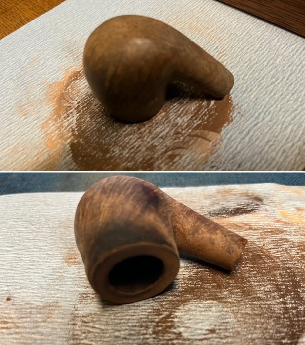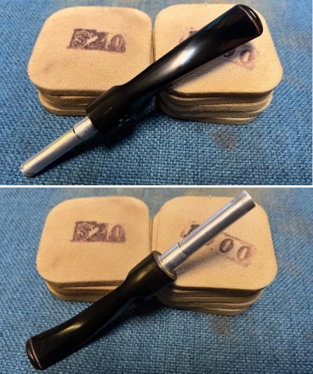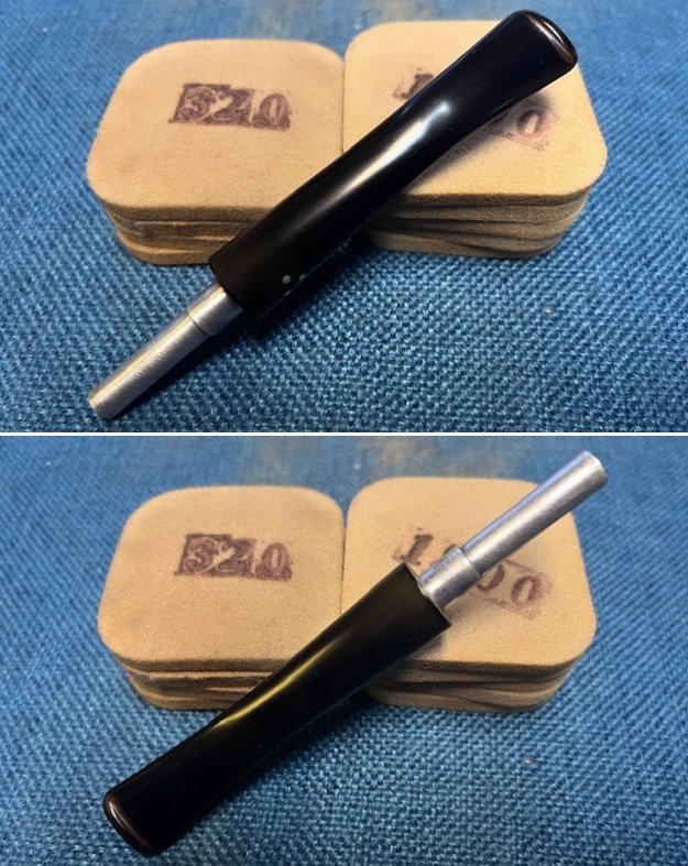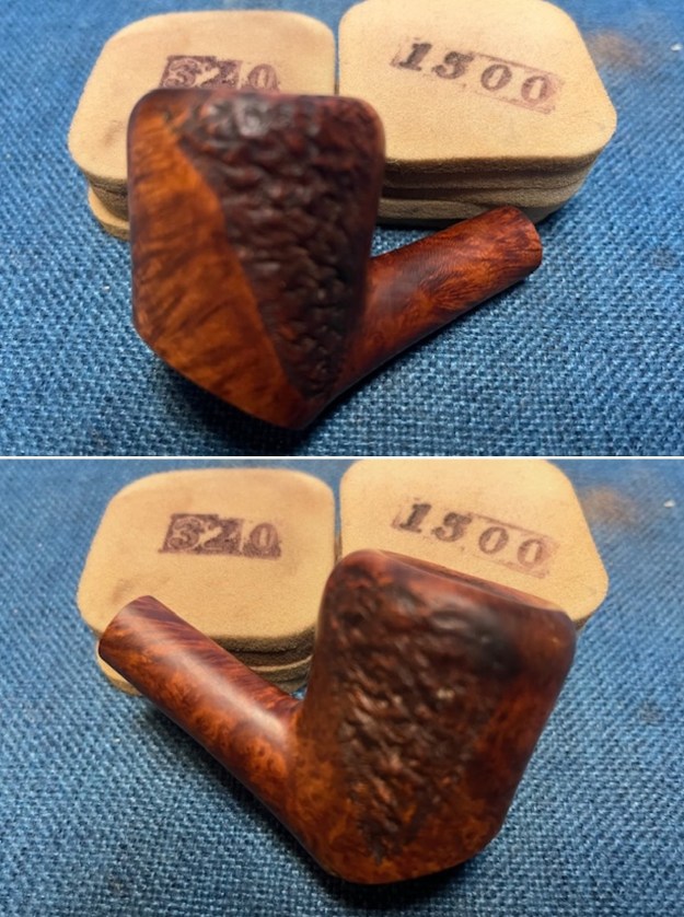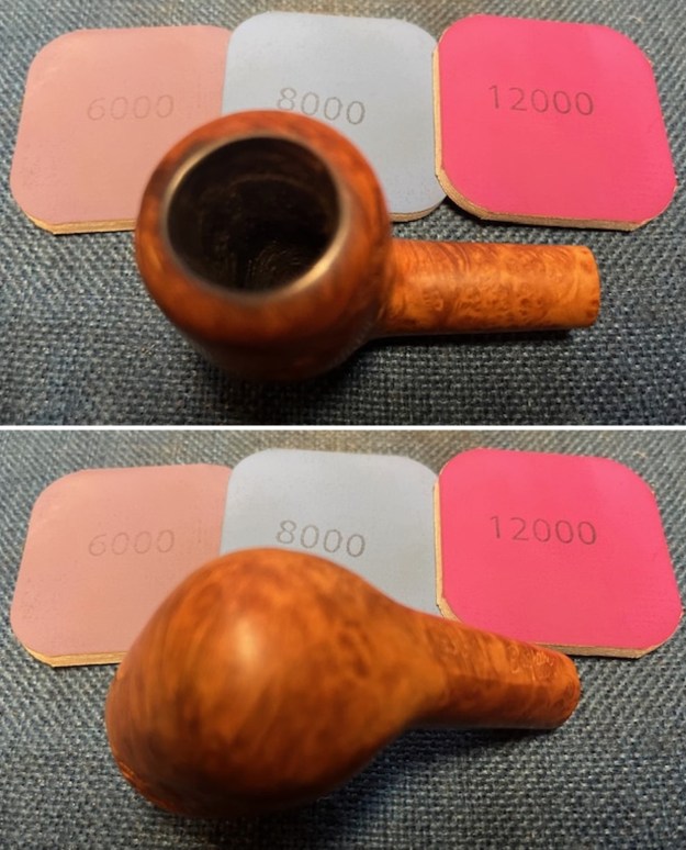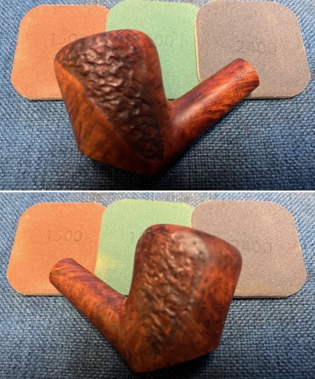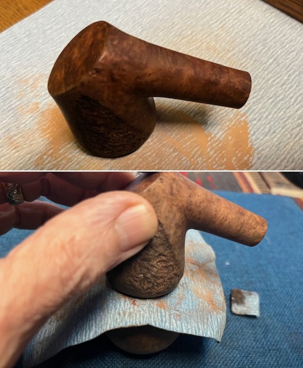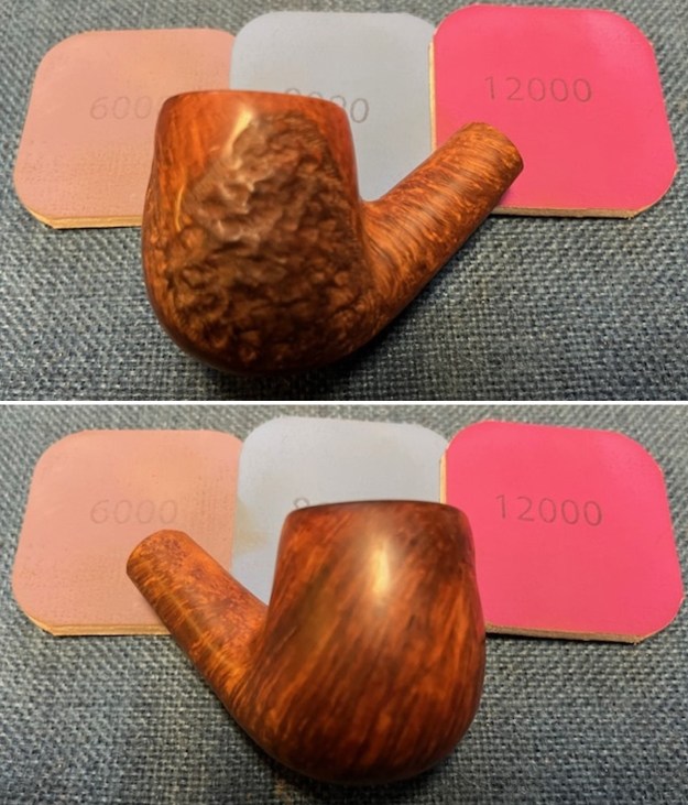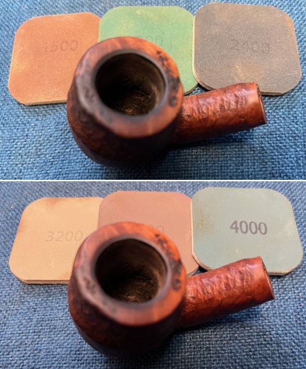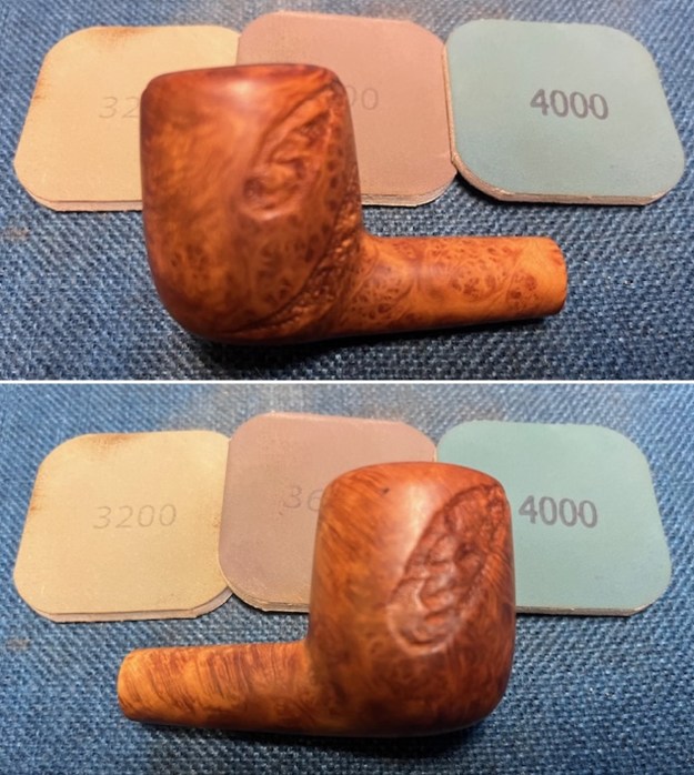 In order to lessen the burns damage on the rim, I ‘topped’ the pipe – that is to say, I gently and evenly sanded the rim on a piece of 400-grit sandpaper. This effectively minimized the damage, without altering the look of the pipe. Fortunately, this required only minimal topping.