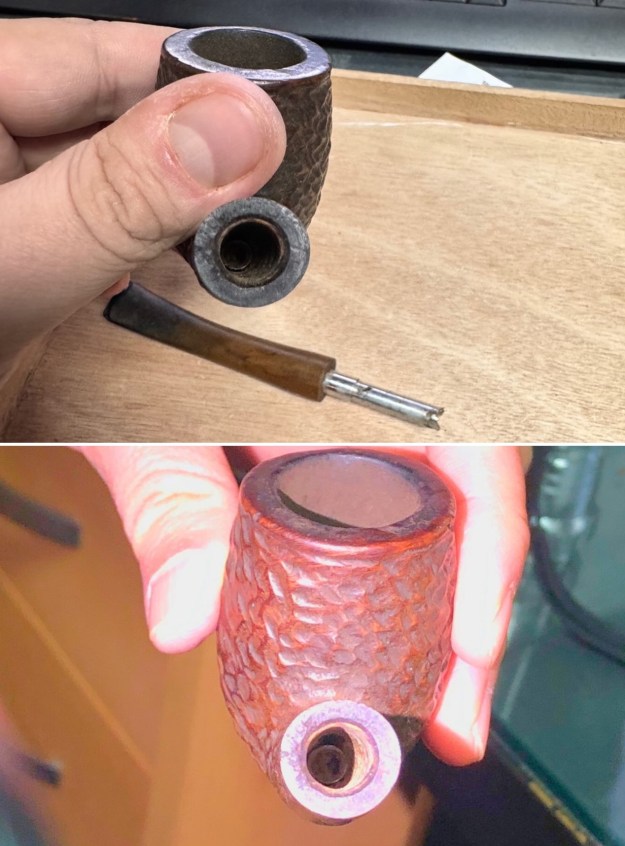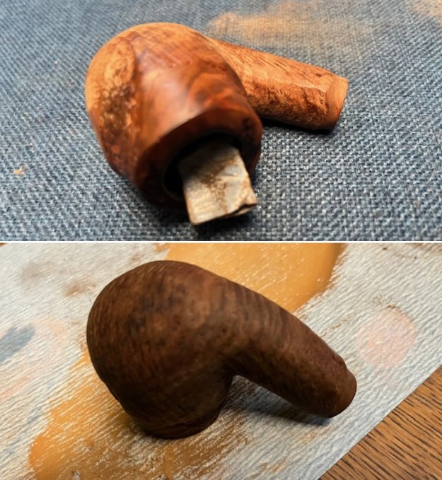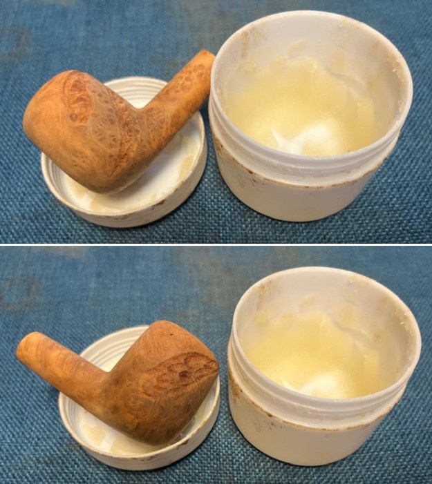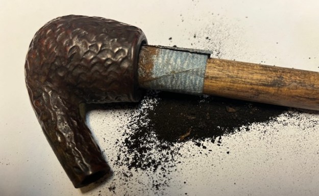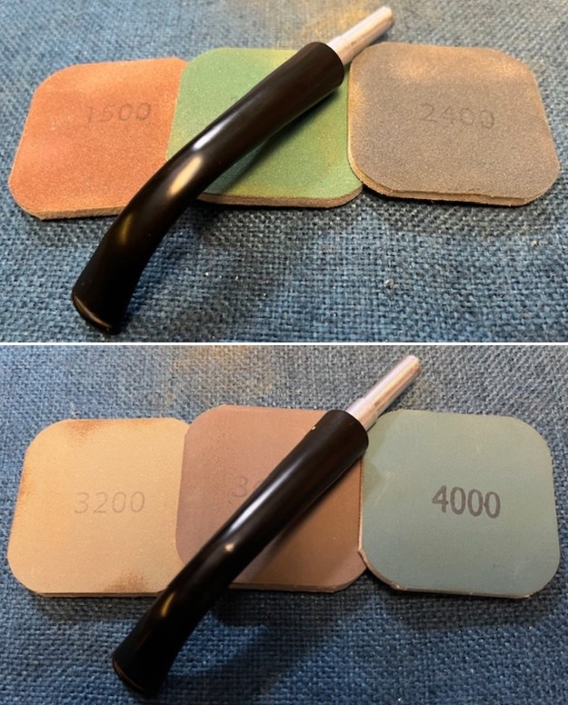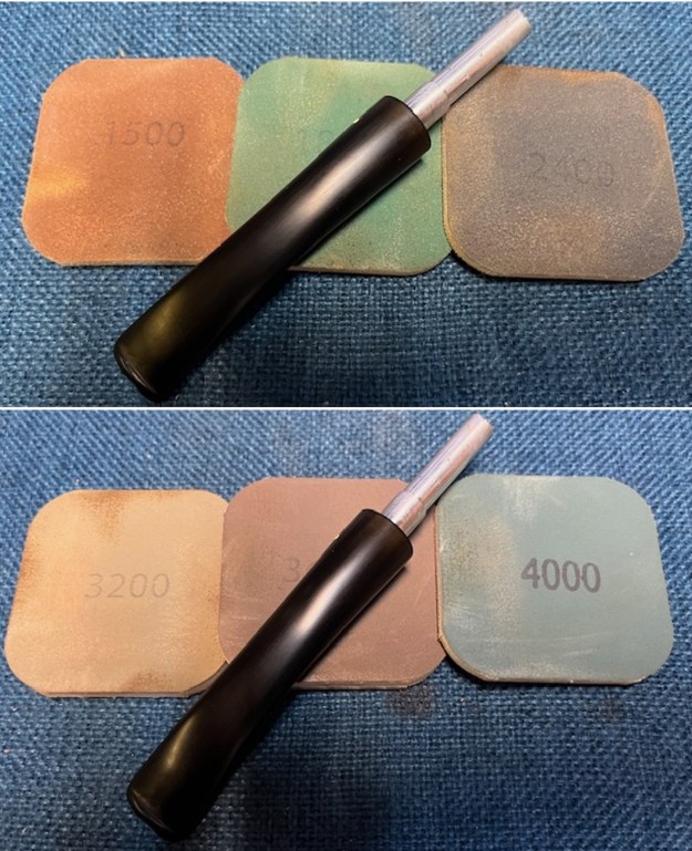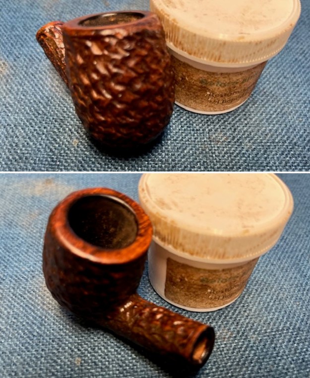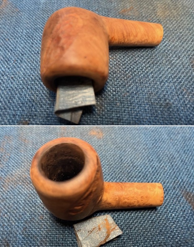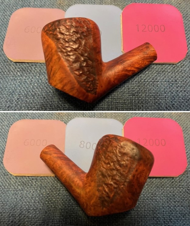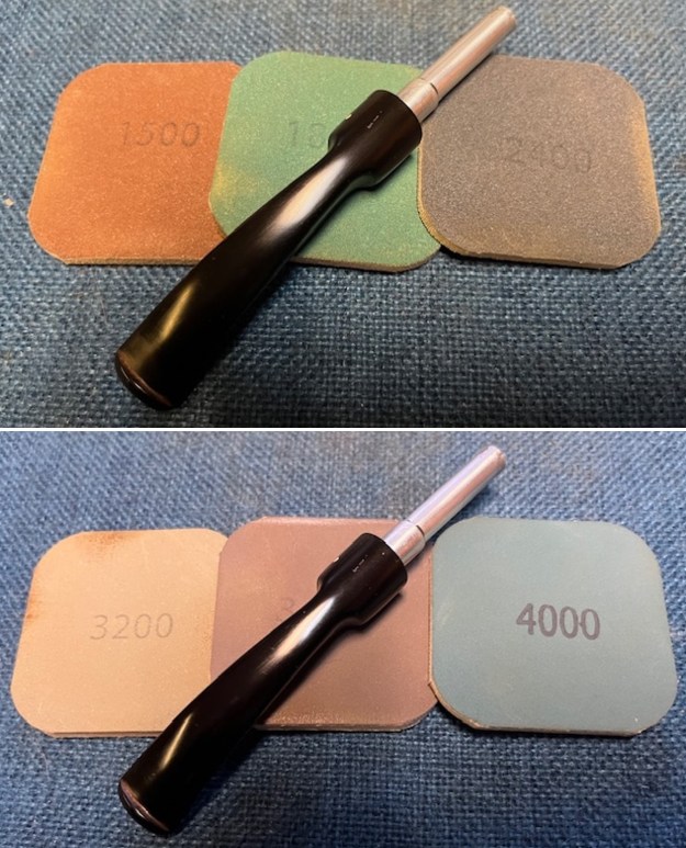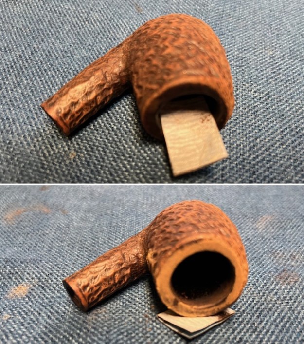 In order to lessen the burns damage on the rim, I ‘topped’ the pipe – that is to say, I gently and evenly sanded the rim on a piece of 400-grit sandpaper. This effectively minimized the damage, without altering the look of the pipe. Fortunately, this required only minimal topping.