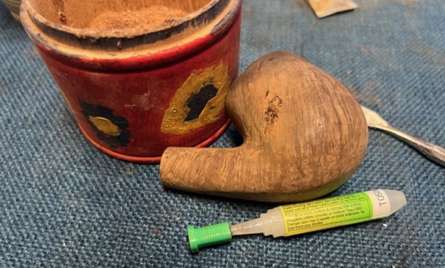 As the stem was now clean and dry, I set about fixing the marks and dents in the vulcanite. This was done by filling those divots with black cyanoacrylate adhesive, impregnated with carbon and rubber. I left this to cure and moved on.