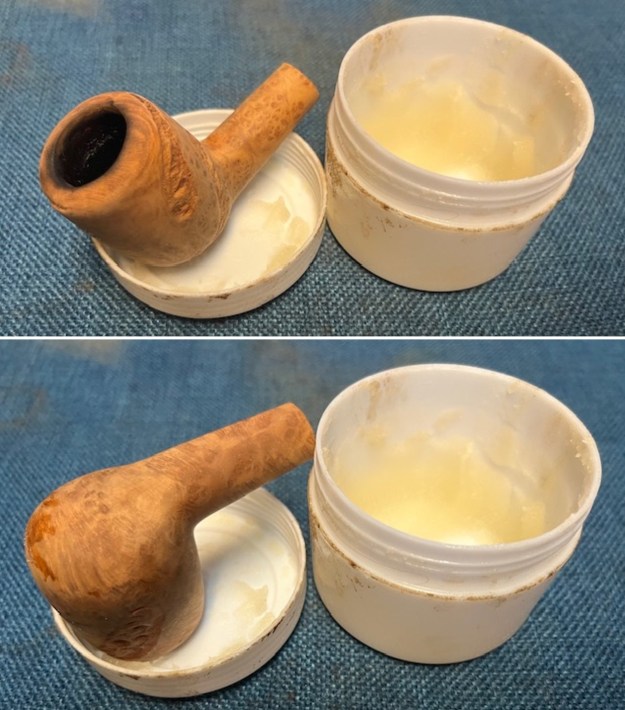 I then decided to ‘de-ghost’ the pipe – that is to say, exorcize the remaining filth from the briar. I filled the bowl and the shank with cotton balls, then saturated them with 99% isopropyl alcohol. I let the stummel sit overnight. This caused the remaining oils, tars and smells to leach out into the cotton.