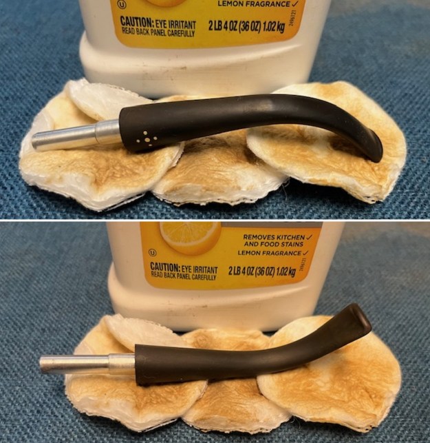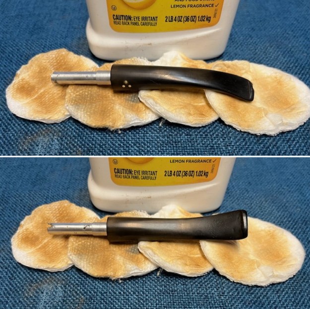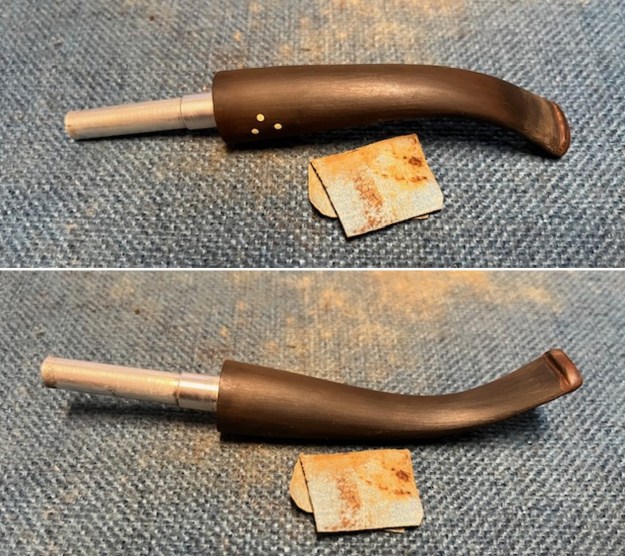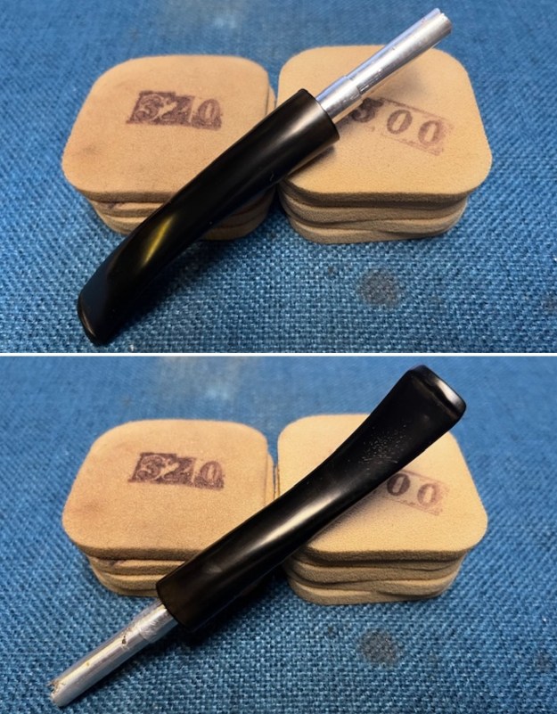 I used a disposable lighter and ‘painted’ the stem with its flame. The gentle heat of the flame can cause the dents in the vulcanite of the stem to expand back into shape. In this case, the vulcanite did move – which was great – but it didn’t move fully. No problem.