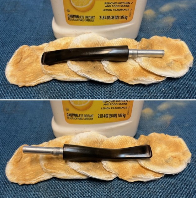 The goal of the next step is the removal (or minimization) of oxidation. Going to my sink, I used cream cleanser, cotton rounds, and a toothbrush, and scoured the stem to remove as much surface oxidation as possible. As the photos show, the result was a hideous, ochre-coloured mess – but better off the stem than on it.