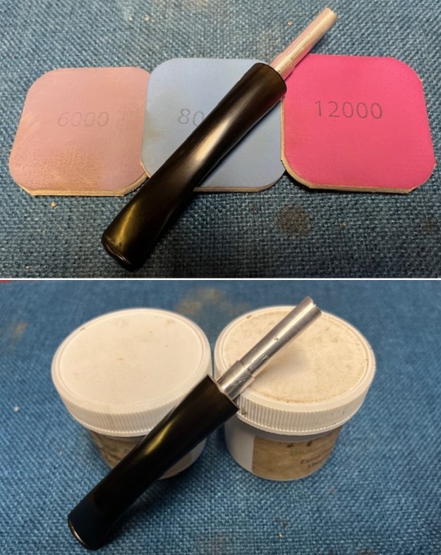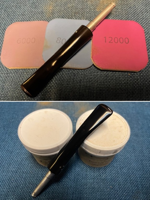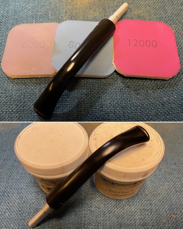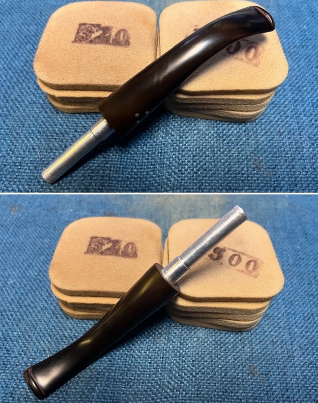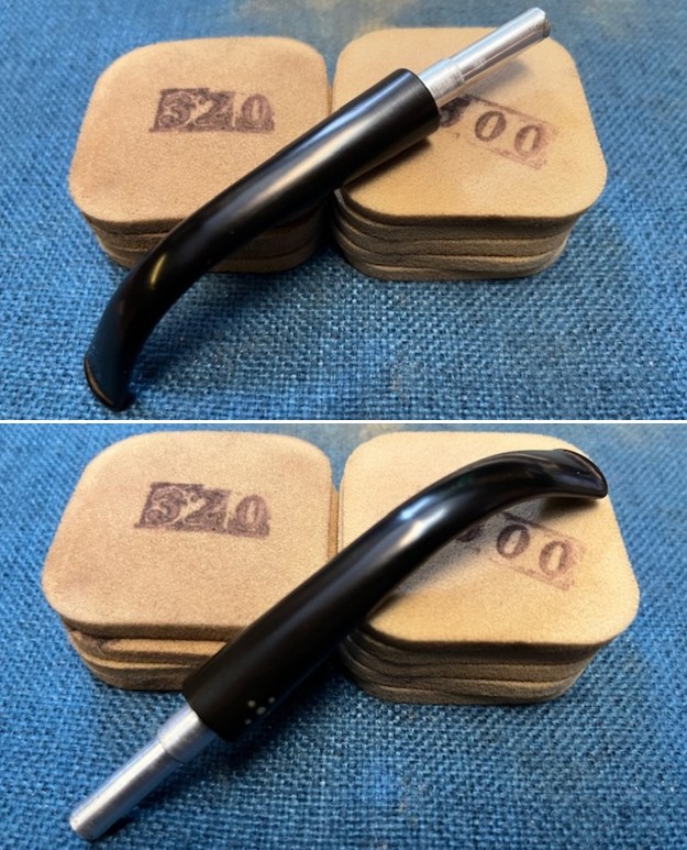 The penultimate step for the stem is sanding. First, with my set of needle files, I reduced the bulk of the cyanoacrylate repairs. I removed the excess adhesive as near to the surface as possible, without cutting into the vulcanite. Following that, I used all nine of the micromesh sanding pads (1,500 through 12,000 grit) to sand out flaws, even out the vulcanite, and provide gentle polishing of the finished surface. I also applied pipe-stem oil while using the last five micromesh pads. There was a wonderful, deep black shine to the stem when I was done.
