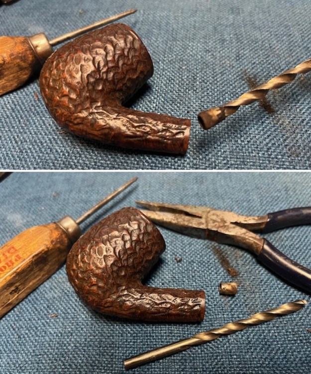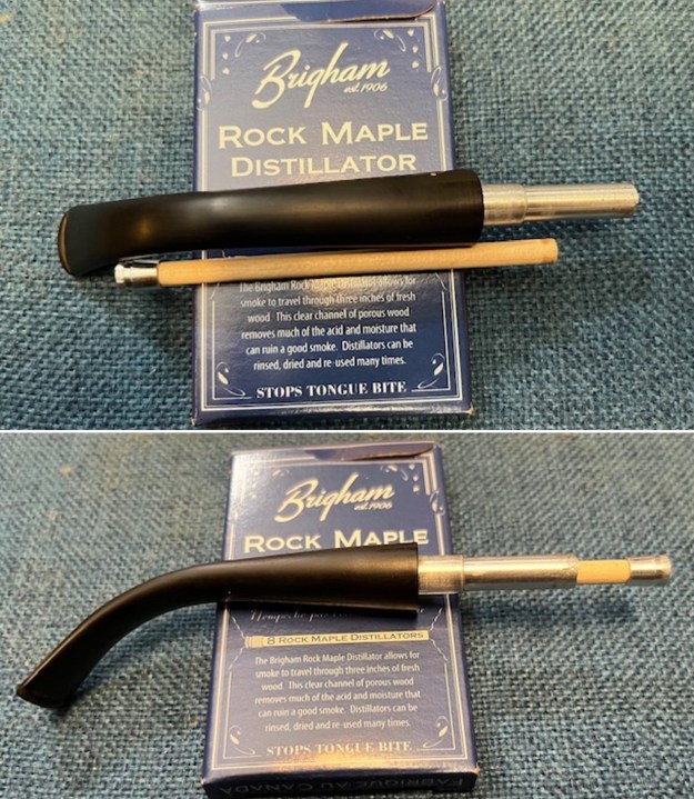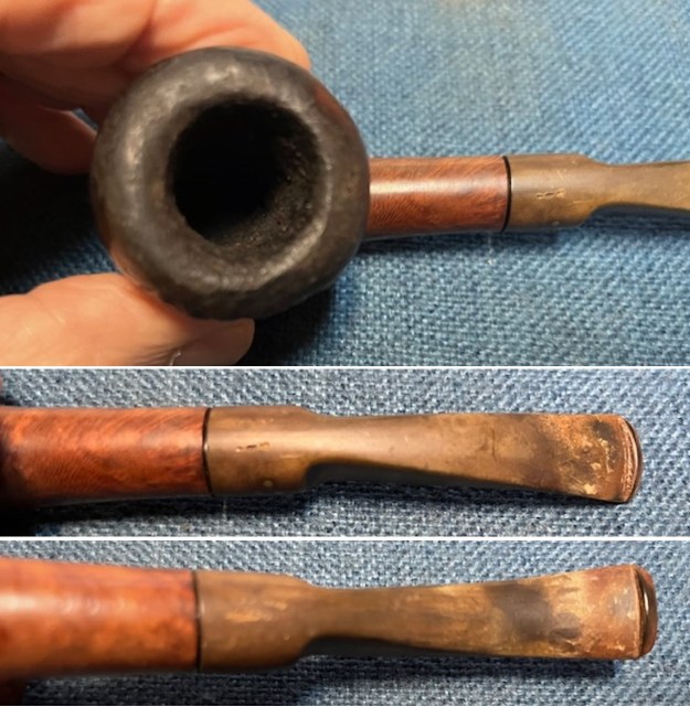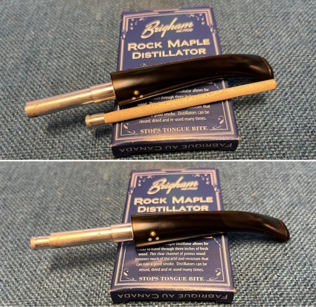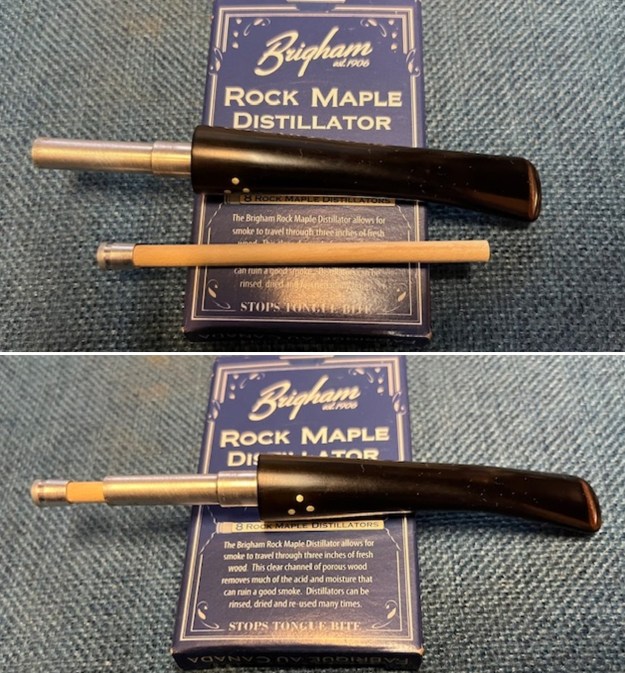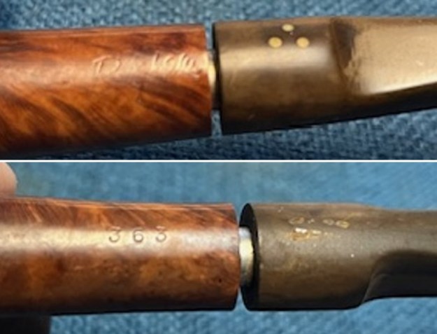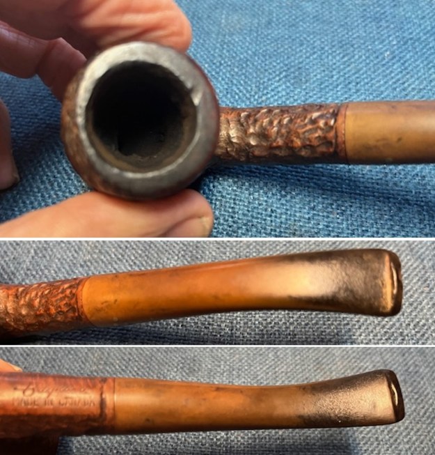 Let’s examine what marks it does have. On the underside of the stummel, we read Brigham [over] Made in Canada. Of course, how those words are marked is what matters in dating Brigham pipes. I’ll get back to that. To the left of the aforementioned markings is the solitary digit 3. I can only assume that this refers to the three brass pins found on the stem.